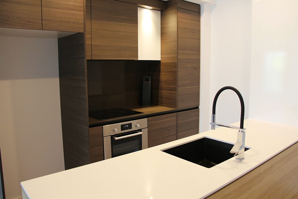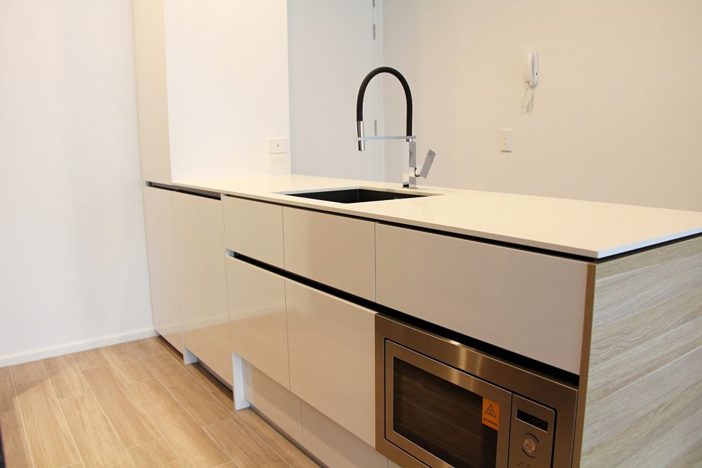 – Modern kitchen with stone benchtop and bespoke timber joinery. Includes live fully integrated dishwasher, live microwave, oven and electric stovetop.