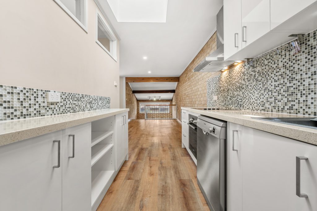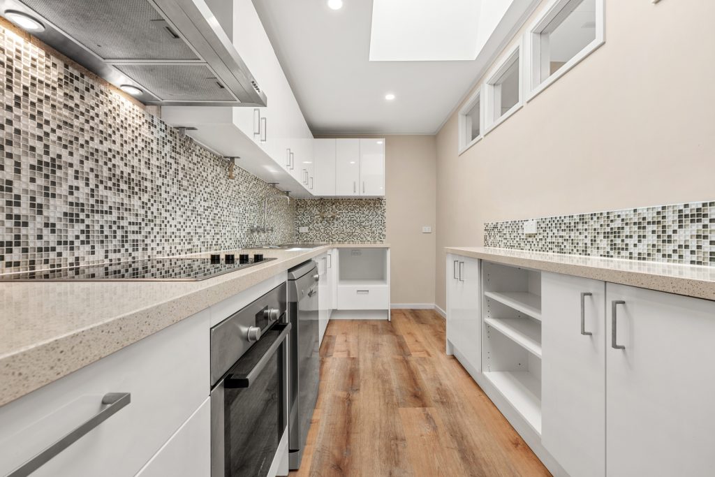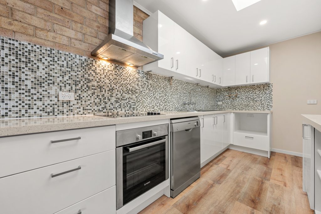 – Stone kitchen bench tops with stainless steel Bosch appliances with a neutral colour scheme