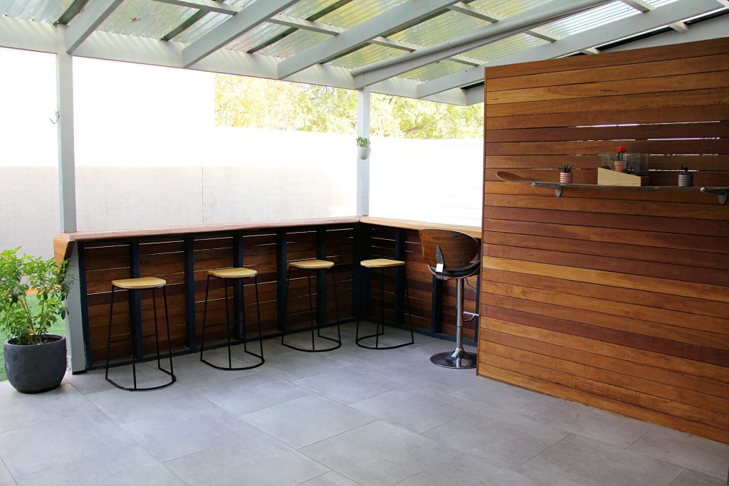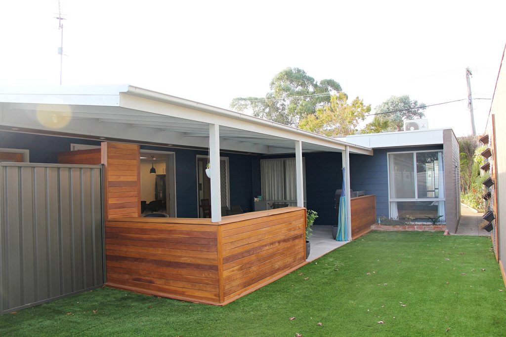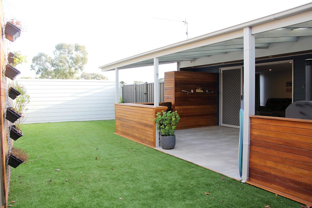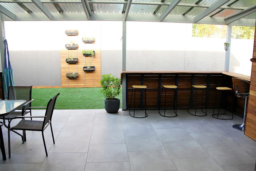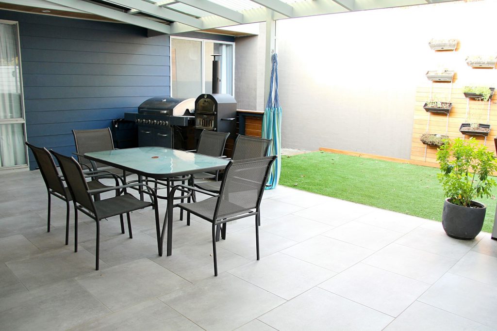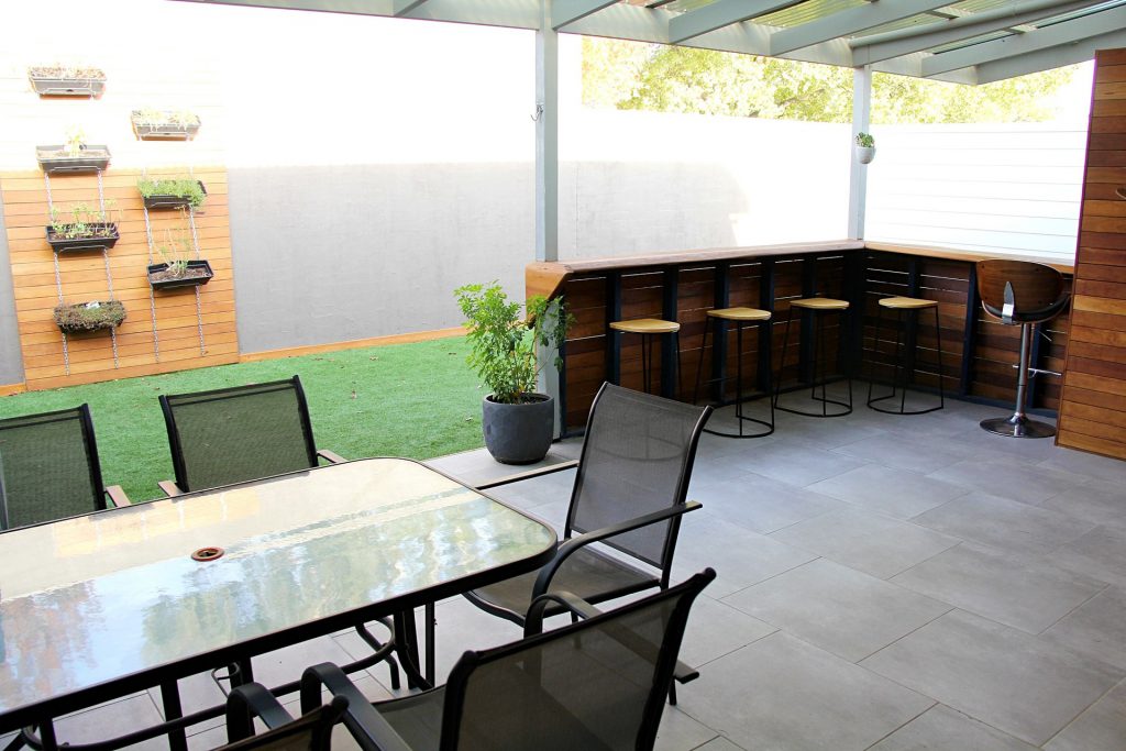 Rear outdoor entertaining area with pergola and vertical garden providing a haven in your home.