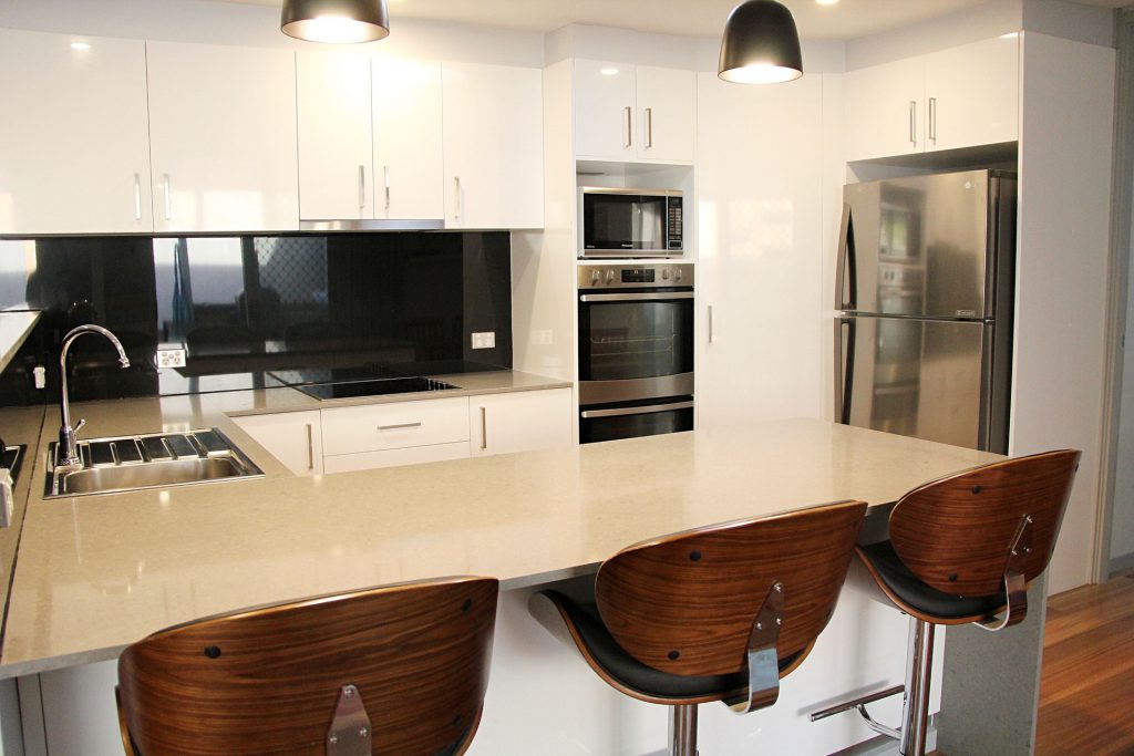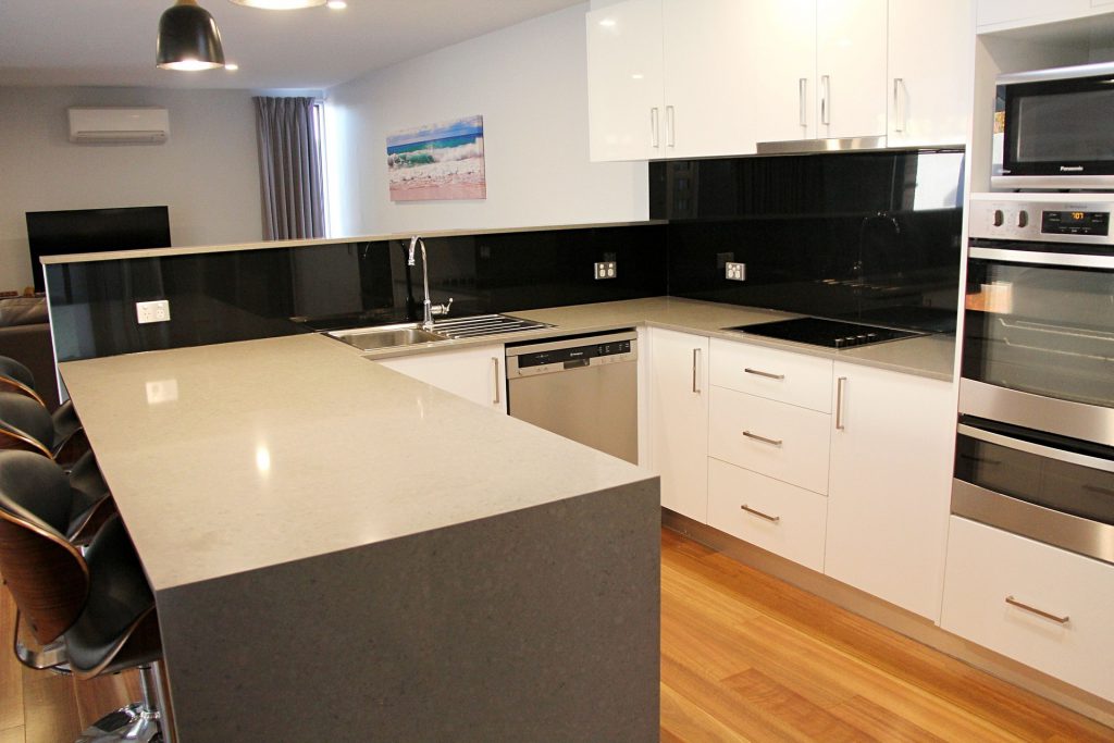 Modern and well-appointed kitchen with electric cooktop, stainless steel dishwasher, stone-bench top and plenty of counter and cupboard space.