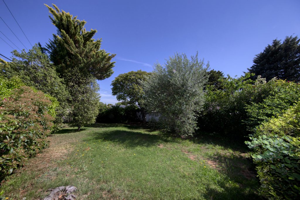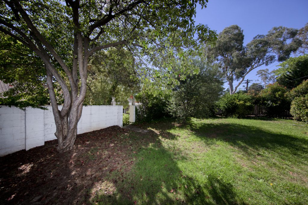Attractive landscaped front garden with shady trees and hardy native shrubs.
