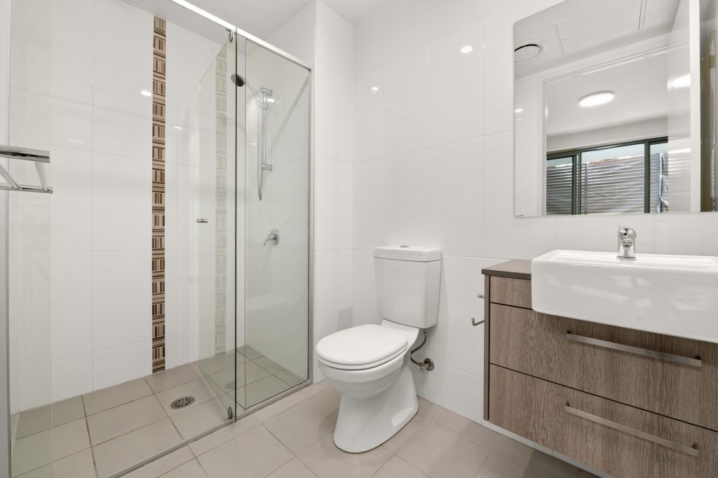 Large main bathroom with modern vanity and large shower