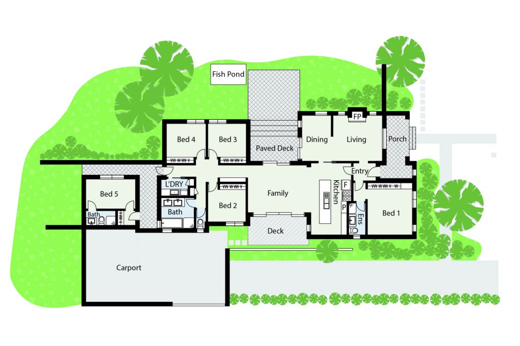 Accomodation offers four double bed sized bedrooms with the kids bedrooms and shared bathroom well separated from the parent’s main bedroom and ensuite. A separate fifth bedroom with its own ensuite is ideal for guests, teenager or in-law accommodation.