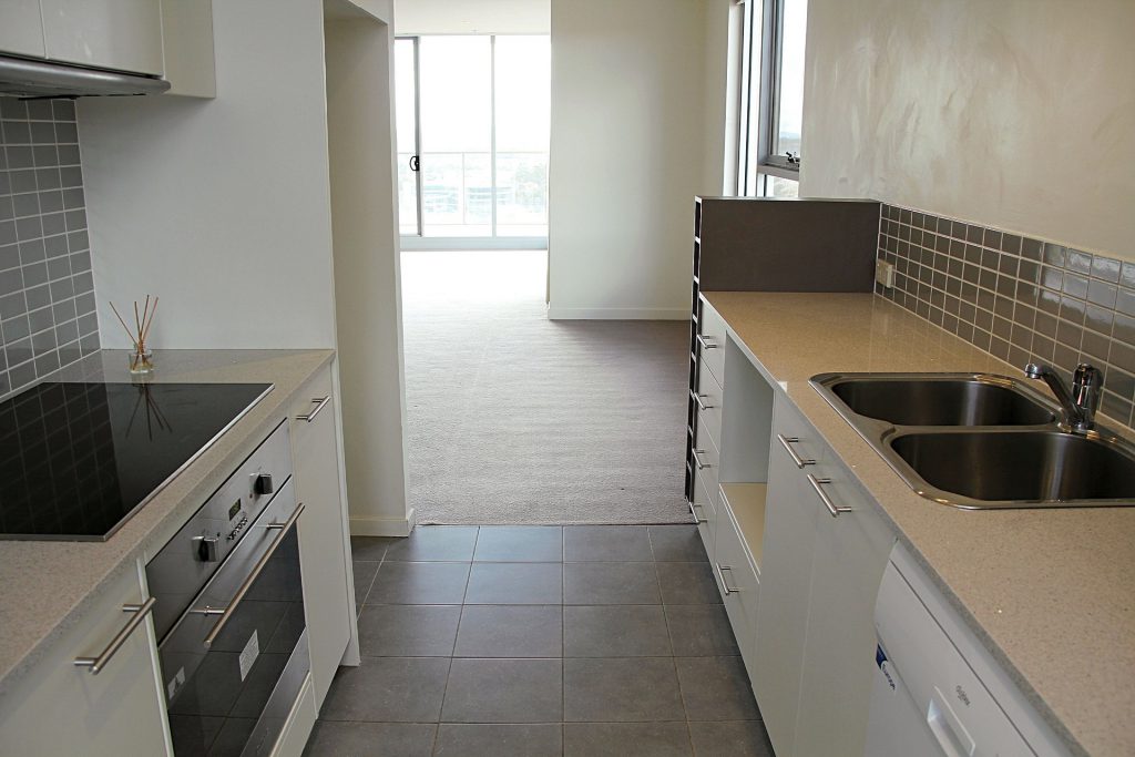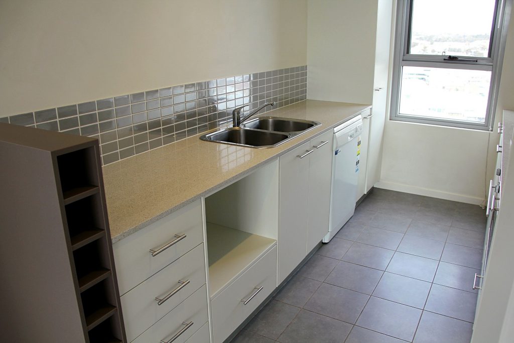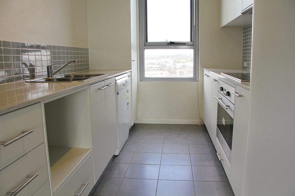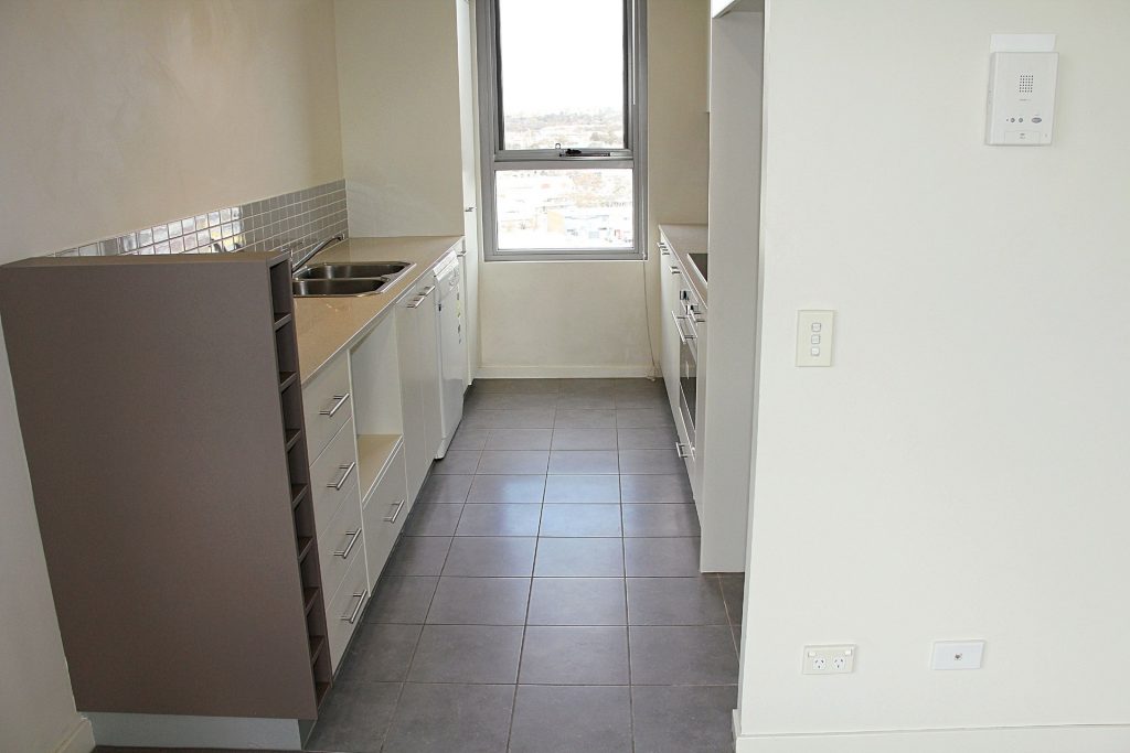 Galley style kitchen with stone bench tops, dishwasher, electric cooking, dedicated microwave space and views towards the Brindabellas.