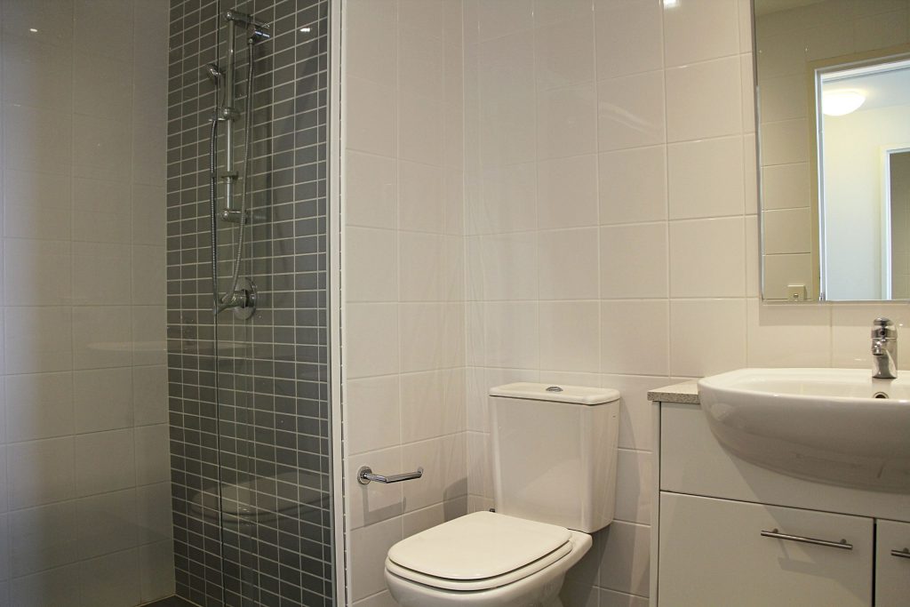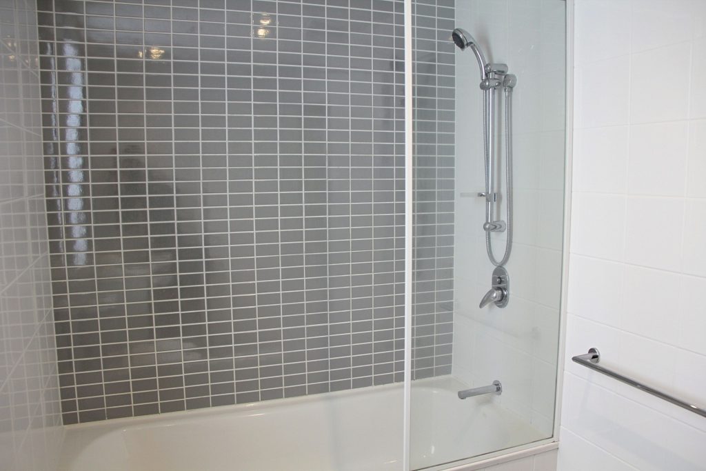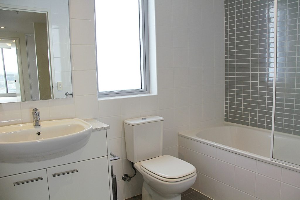 Modern main bathroom includes combined bath/shower.