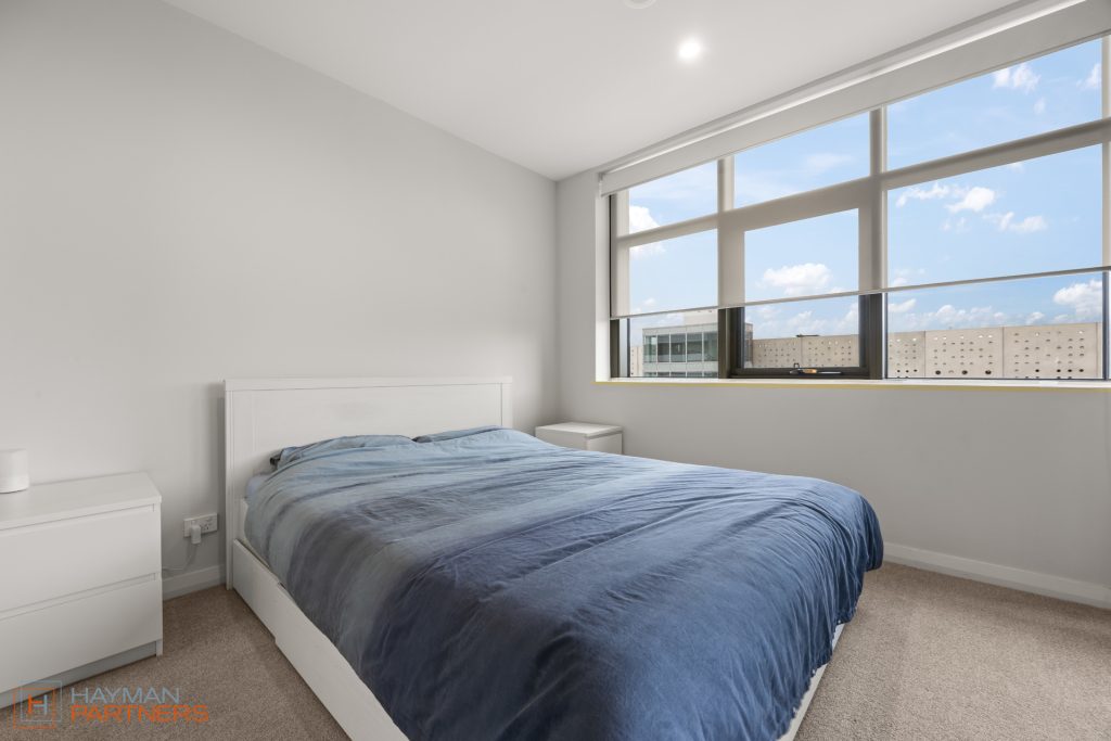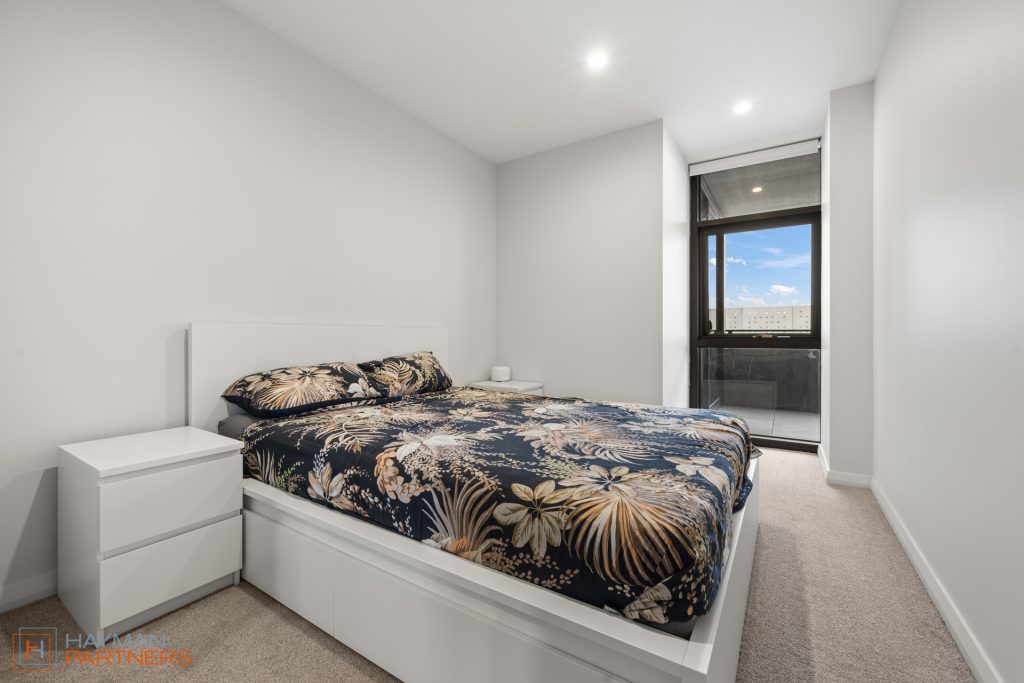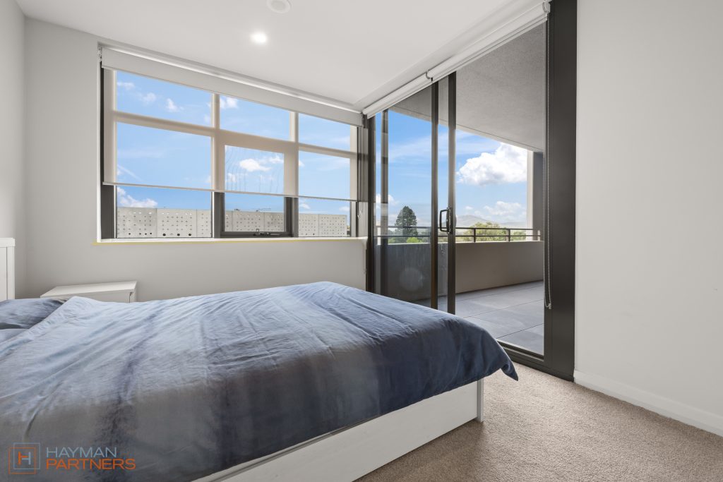 Accommodations are provided by two generously sized bedrooms, both equipped with built-in robes. The large master bedroom features an extensive wall of wardrobes, custom-fitted shelving, and ample hanging space for those who appreciate an organized closet space. Natural light floods this bedroom, leading seamlessly to an undercover balcony that offers a delightful mix of urban and greenspace views.