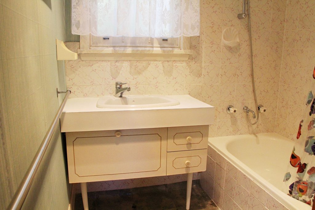 Bathroom includes bath/shower combination and convenient storage cupboard.