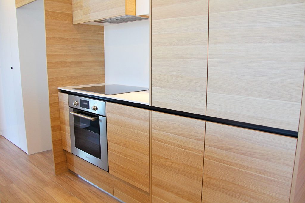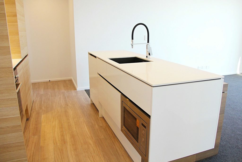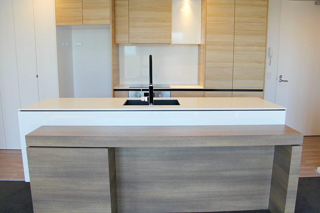 Modern kitchen with stone benchtop and bespoke timber joinery. Includes live fully integrated dishwasher, live microwave, oven and electric stovetop.