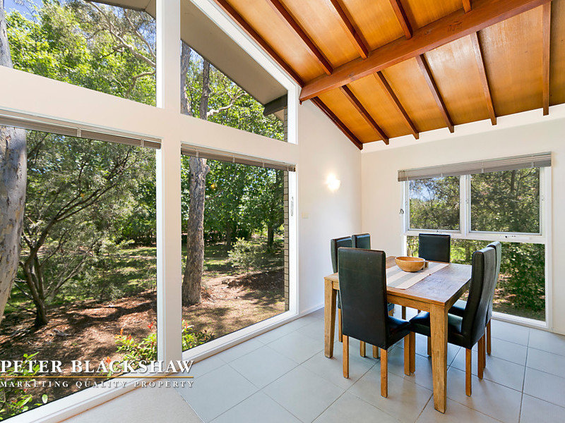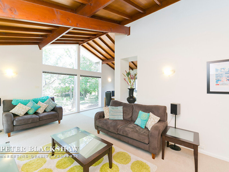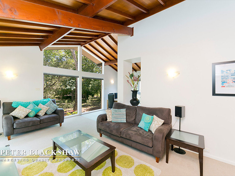 Light and airy living room with stylish angled ceilings & enormous picture windows capturing a superb leafy vista