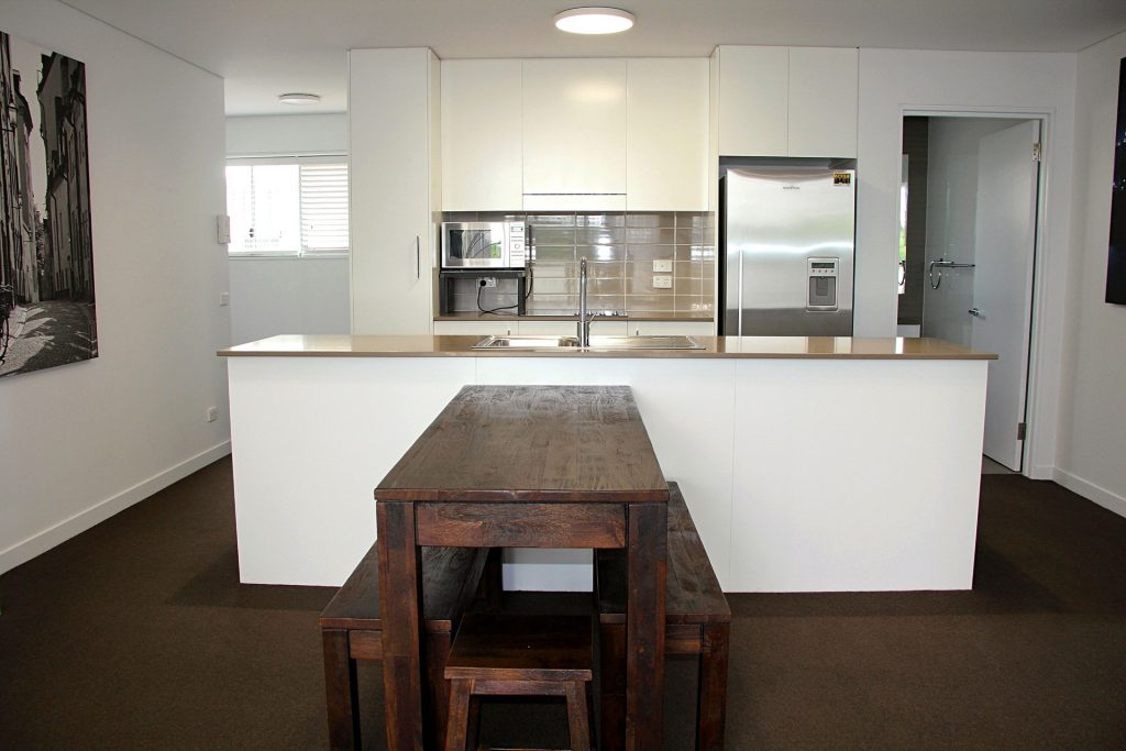 Modern kitchen with attractive stone benchtops, electric cooking and plenty of storage space.