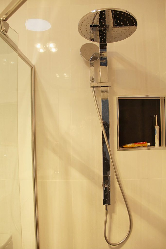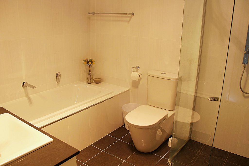 Designer bathroom with full sized bath and separate shower recess with dual shower heads.