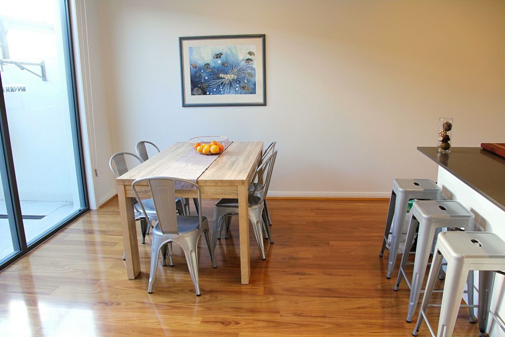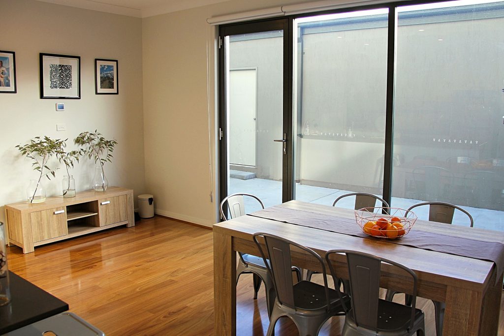 Adjacent meals area opens out to sunny private patio.