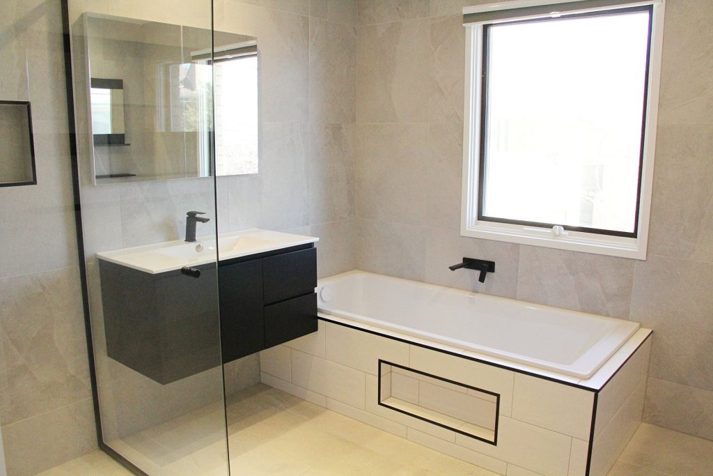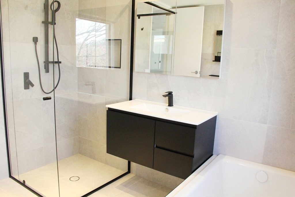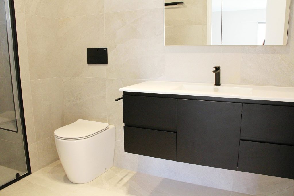 – Gorgeous main bathroom with stylish black detailing throughout. Includes modern vanity, bathtub and separate shower plus convenient separate toilet.