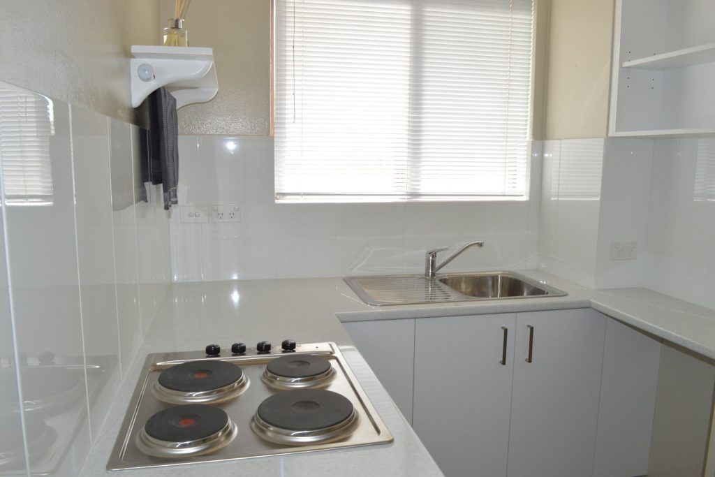 – Contemporary kitchen with electric cooking, great storage and functional layout.