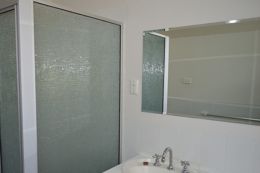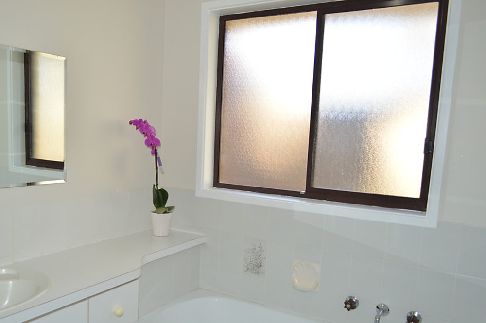 Sparkling bathroom with bath & separate shower recess, thoughtfully designed with extra bench space and good storage.