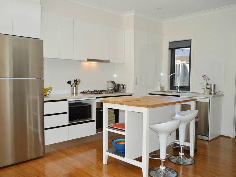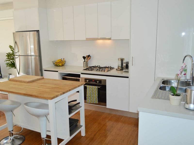 Sleek designer kitchen with handy island bench for easy food preparation. Quality appliances including dishwasher, gas cooktop and electric oven.