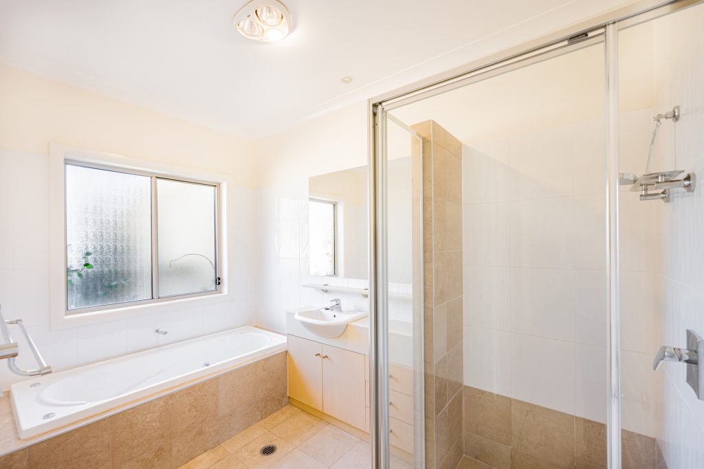 Modern main bathroom with vanity, bathtub and separate shower recess.