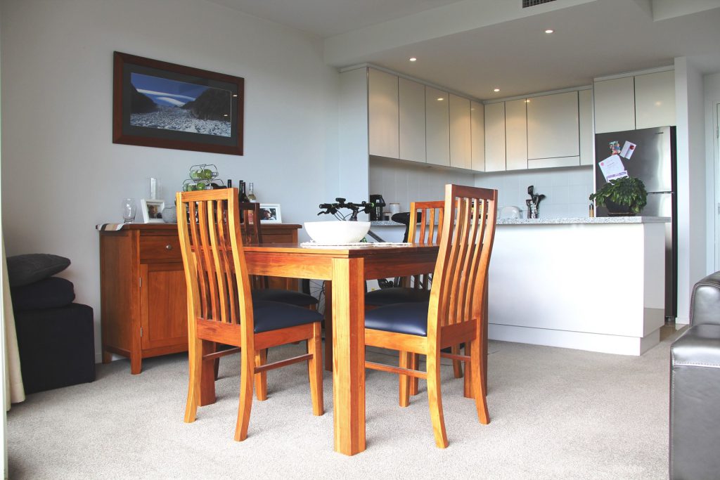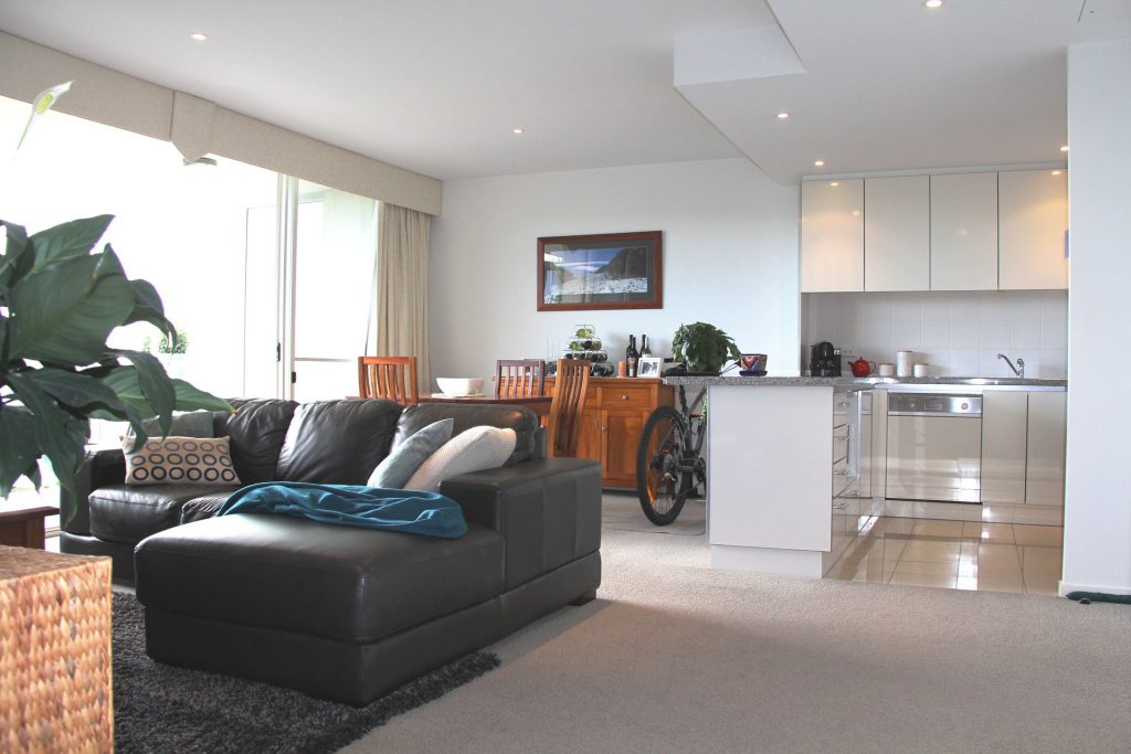 Open plan spacious sunny living and dining area with neutral decor.