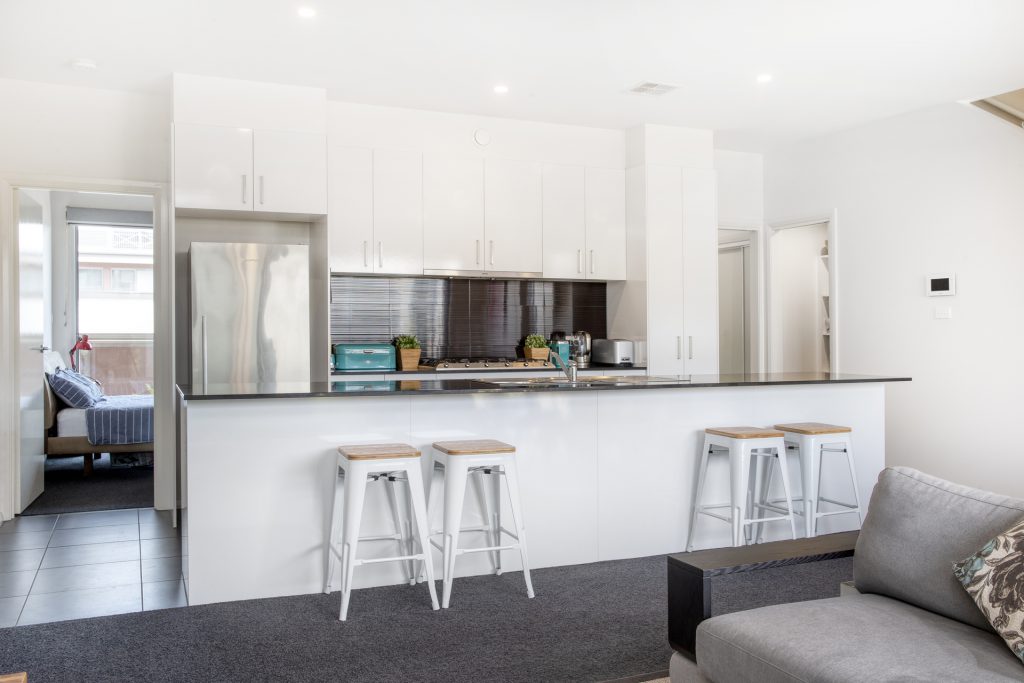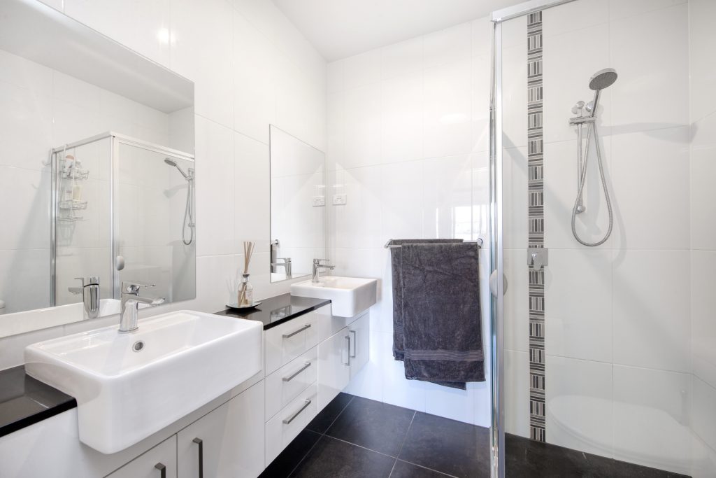 Two bedrooms include modern ensuites, one with a built-in robe and the other with a walk-in robe.