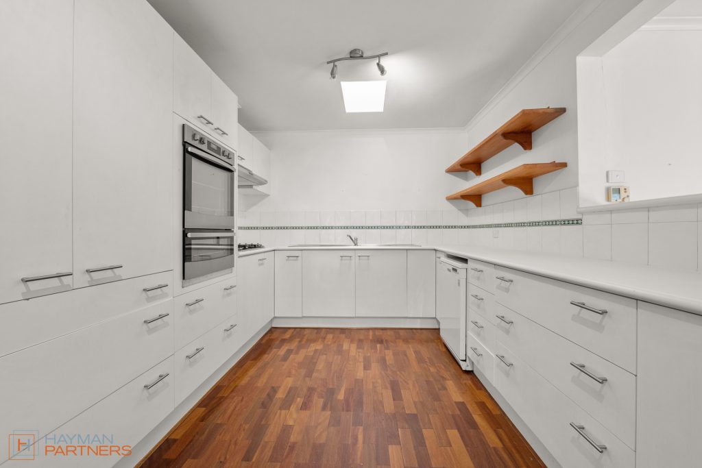 Large U-shaped kitchen with abundant bench space, plenty of drawers, built in dishwasher and four-burner gas cooktop