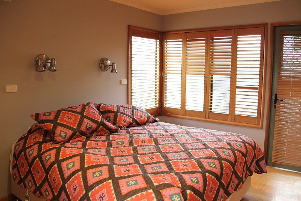The bedroom opens to a sunny private deck and includes bed, bedside tables, lamps and built in robe.