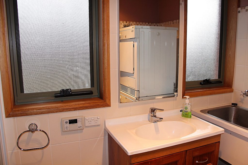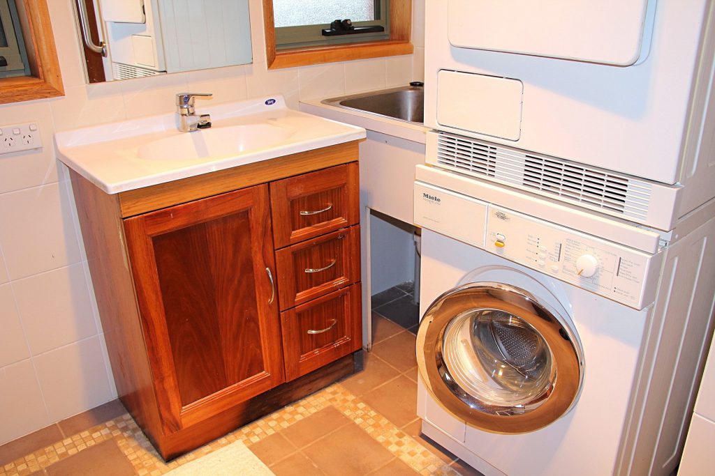 Bathroom and laundry combined with washing machine and dryer.