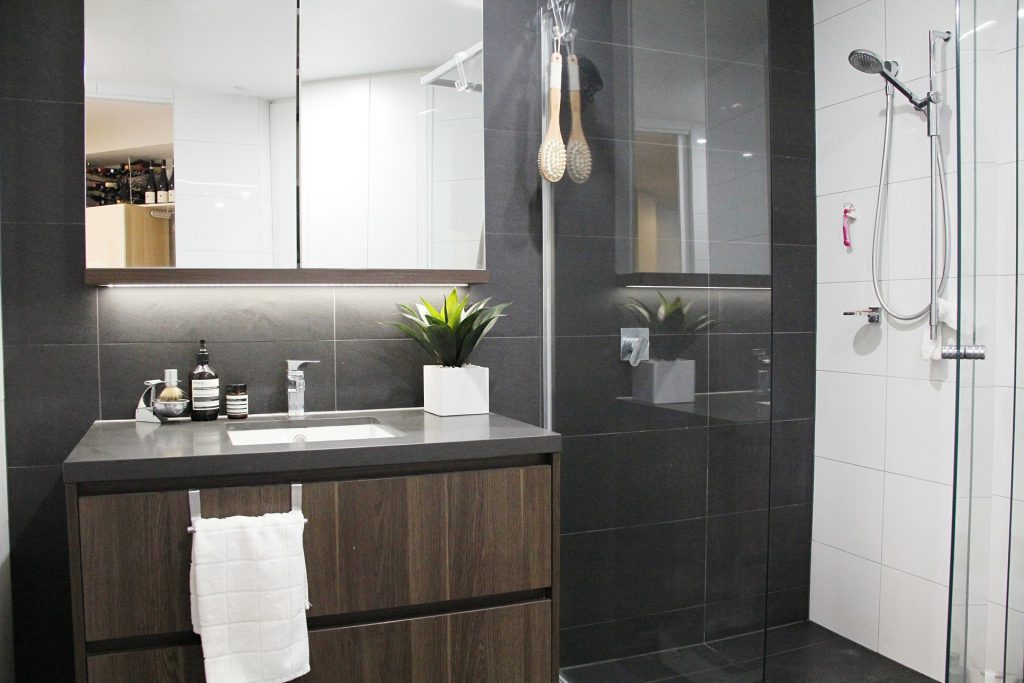 – Stylish two way bathroom with modern vanity, shower and toilet.