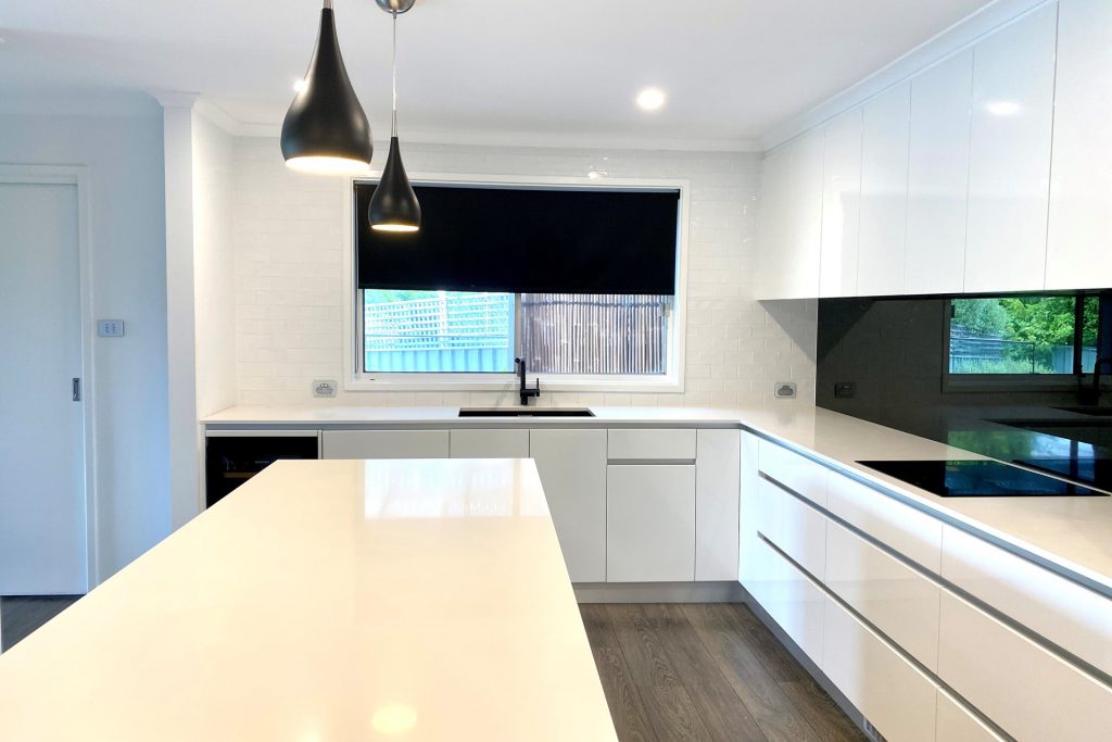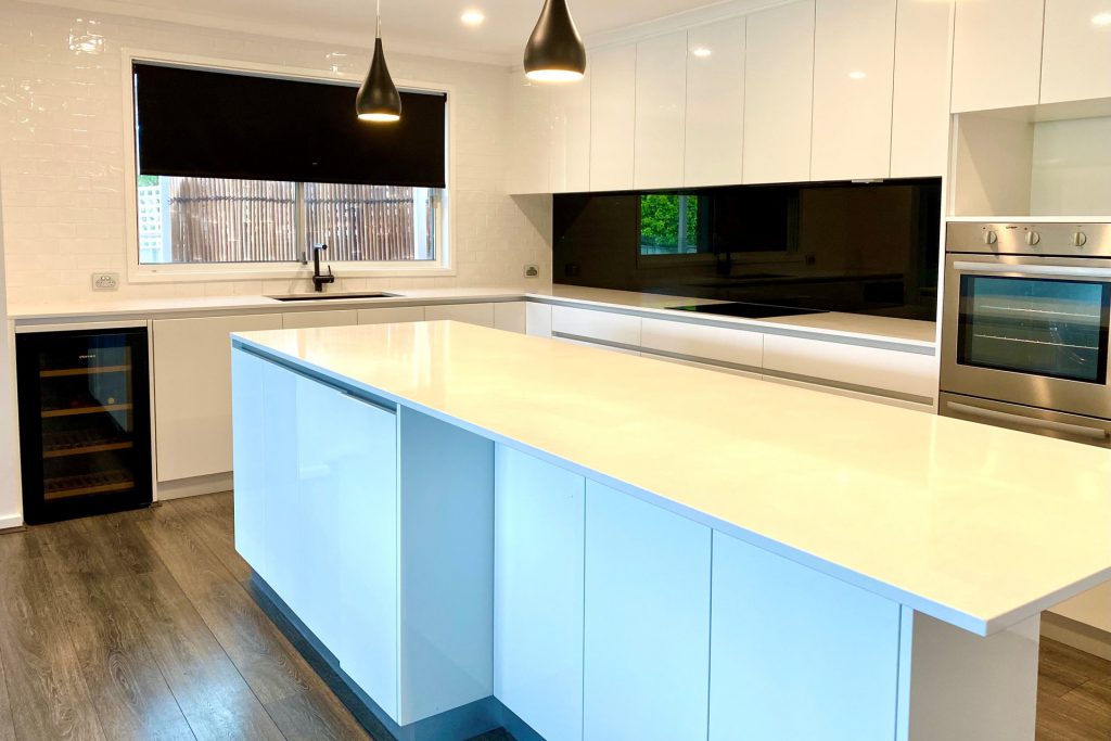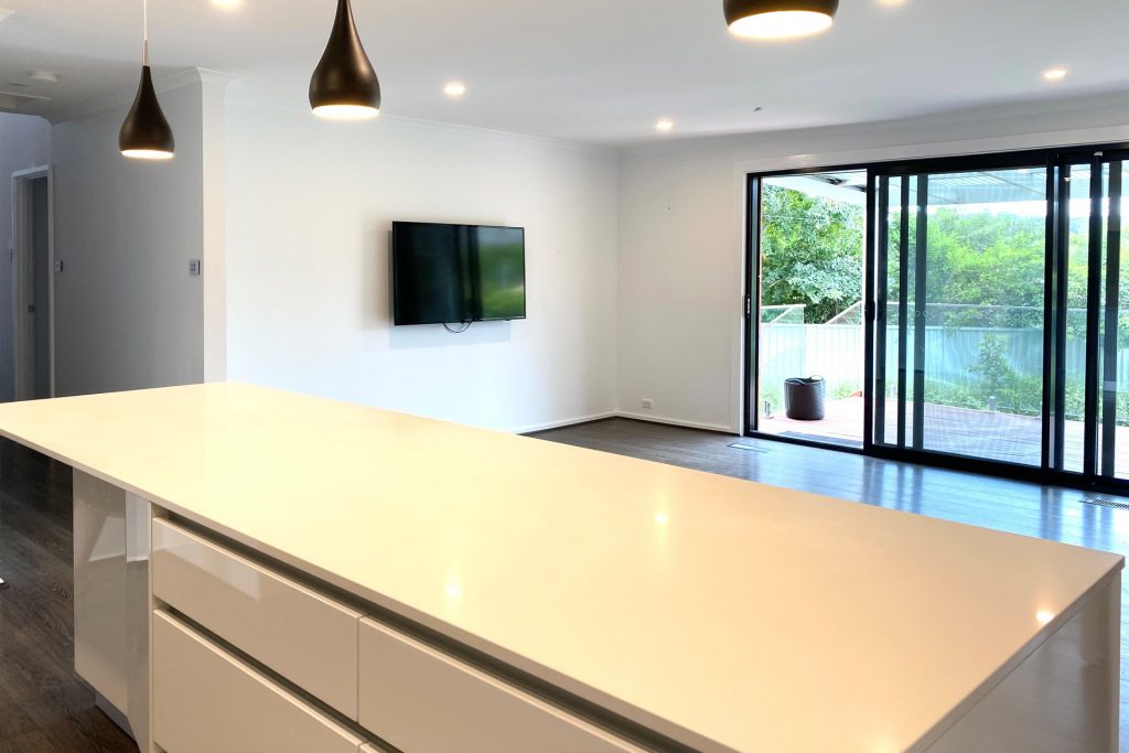 Large modern kitchen with large bench space, induction cooktop, electric oven, dishwasher, wine fridge & plenty of cupboard and pantry space.