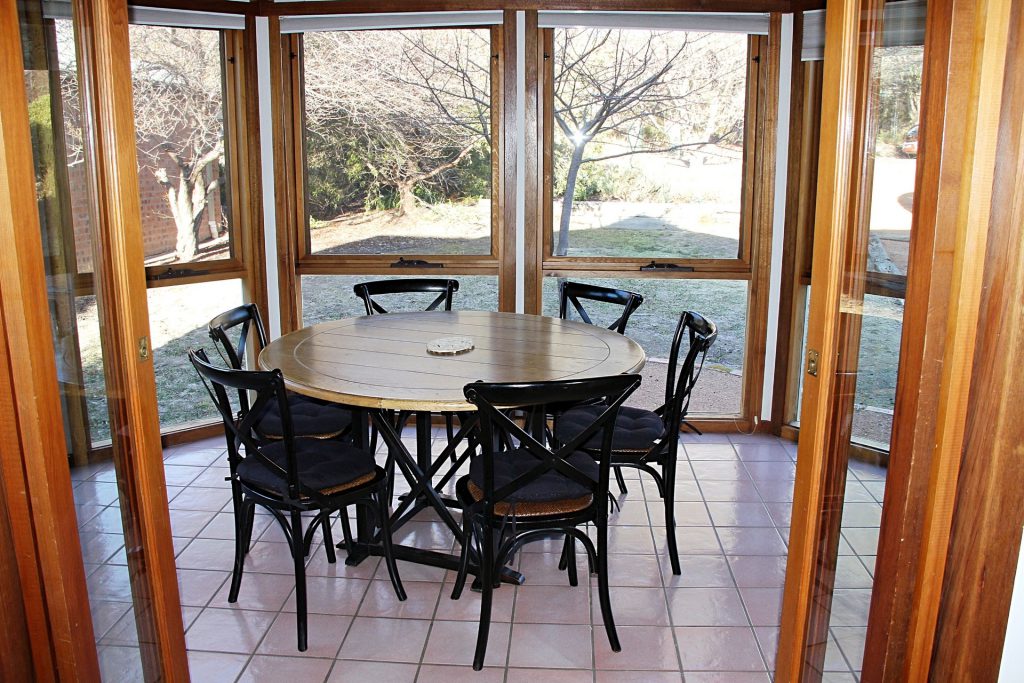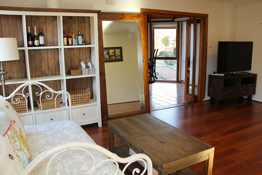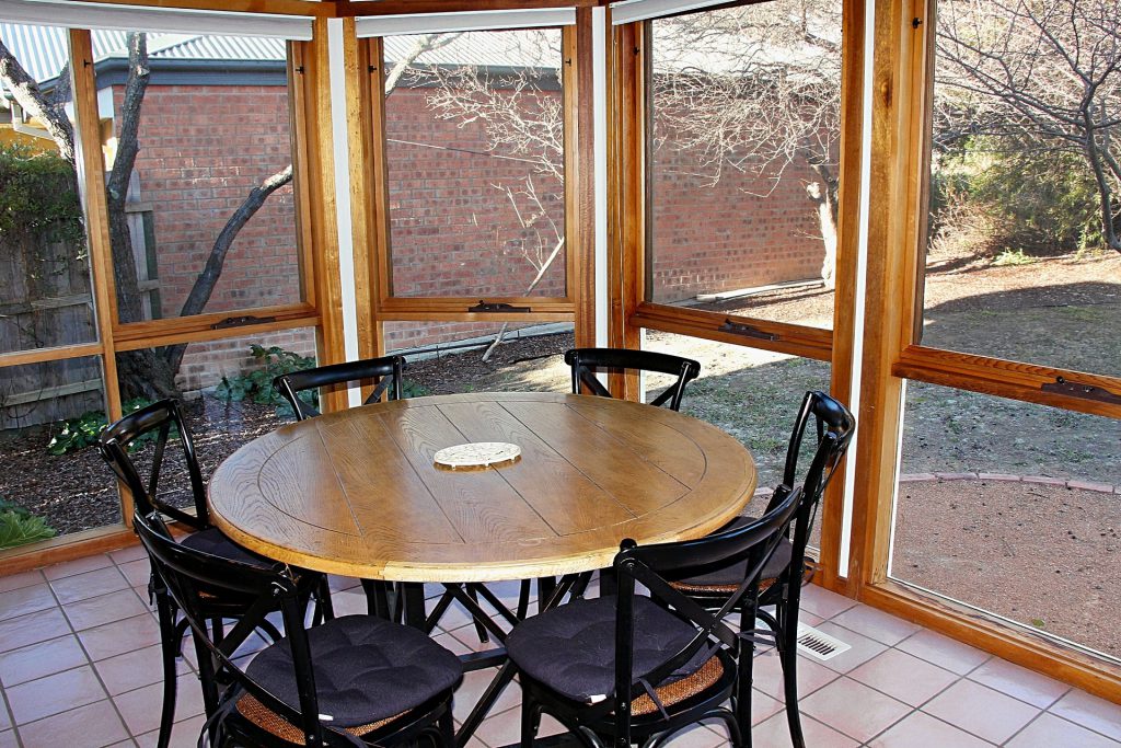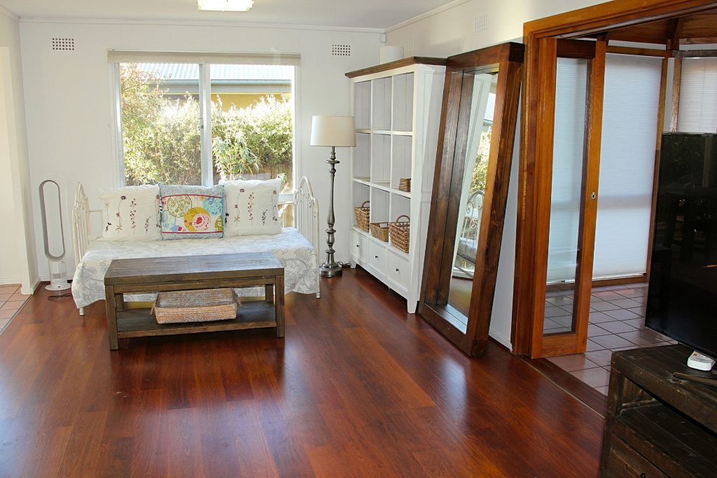 Spacious lounge room with TV, cabinet, lounge setting, storage space and attractive timber flooring. Bi-fold doors enter into light filled sunroom that includes dining setting and Luxaflex blinds.