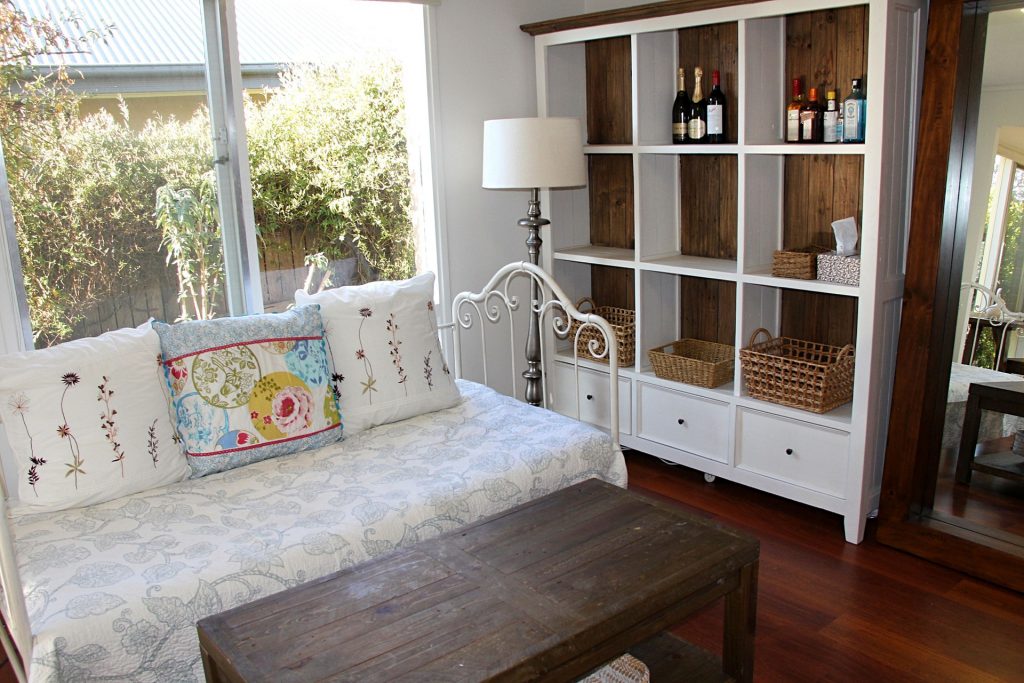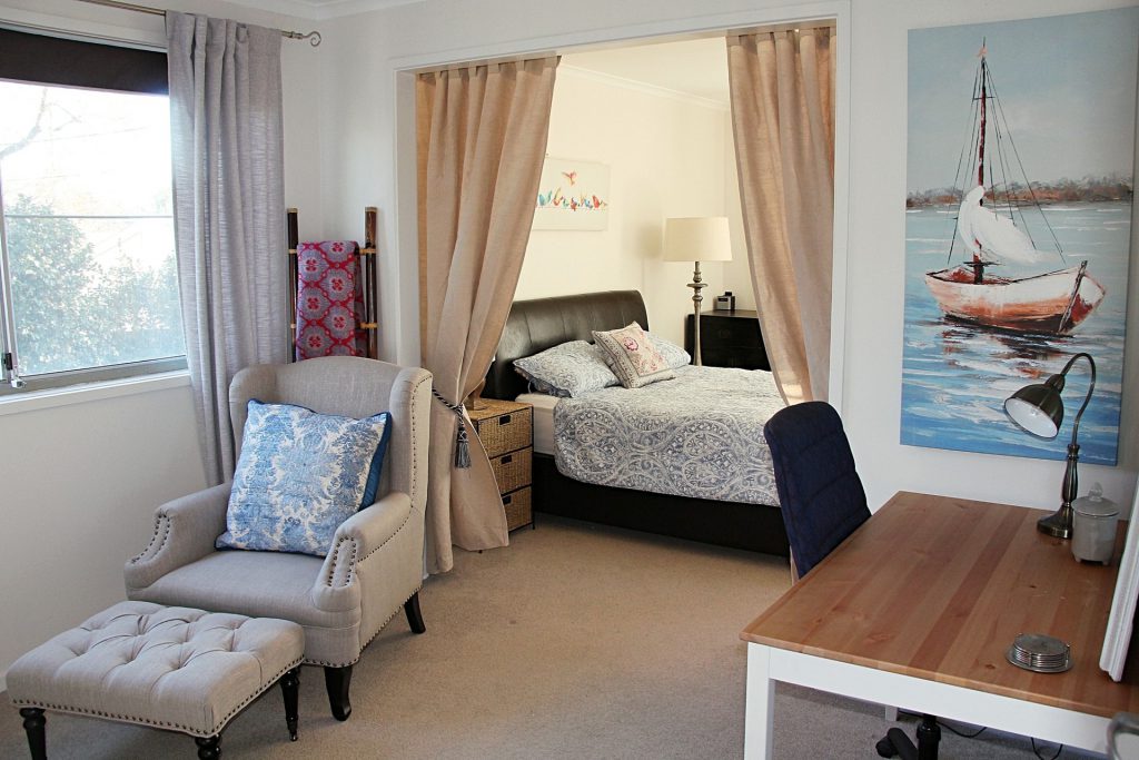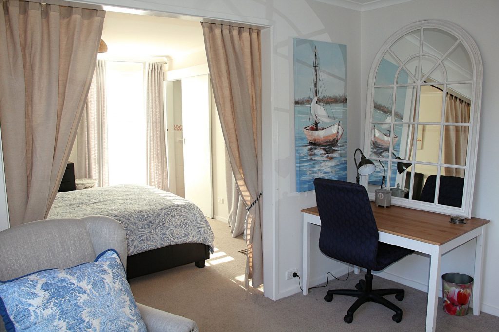 Extensive master bedroom with access to back deck and includes separate sitting area with built-in storage, comfortable chair ensemble and desk area. Ensuite includes shower and toilet.