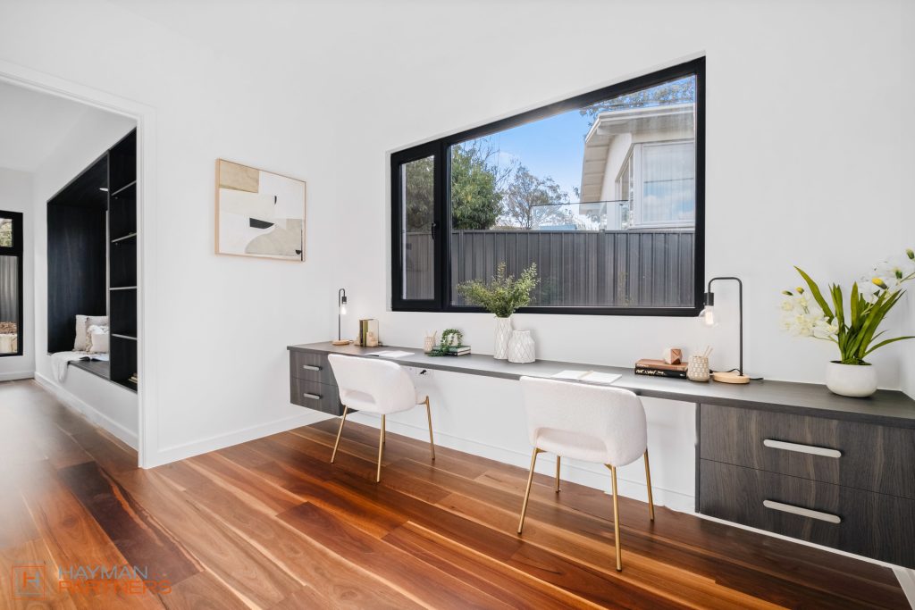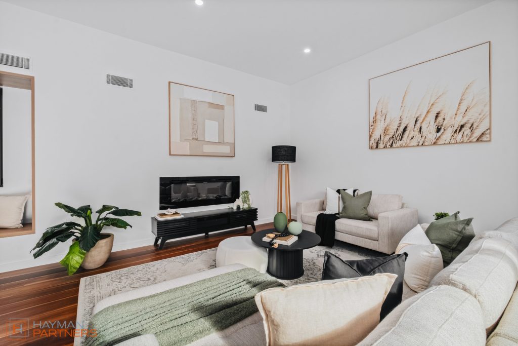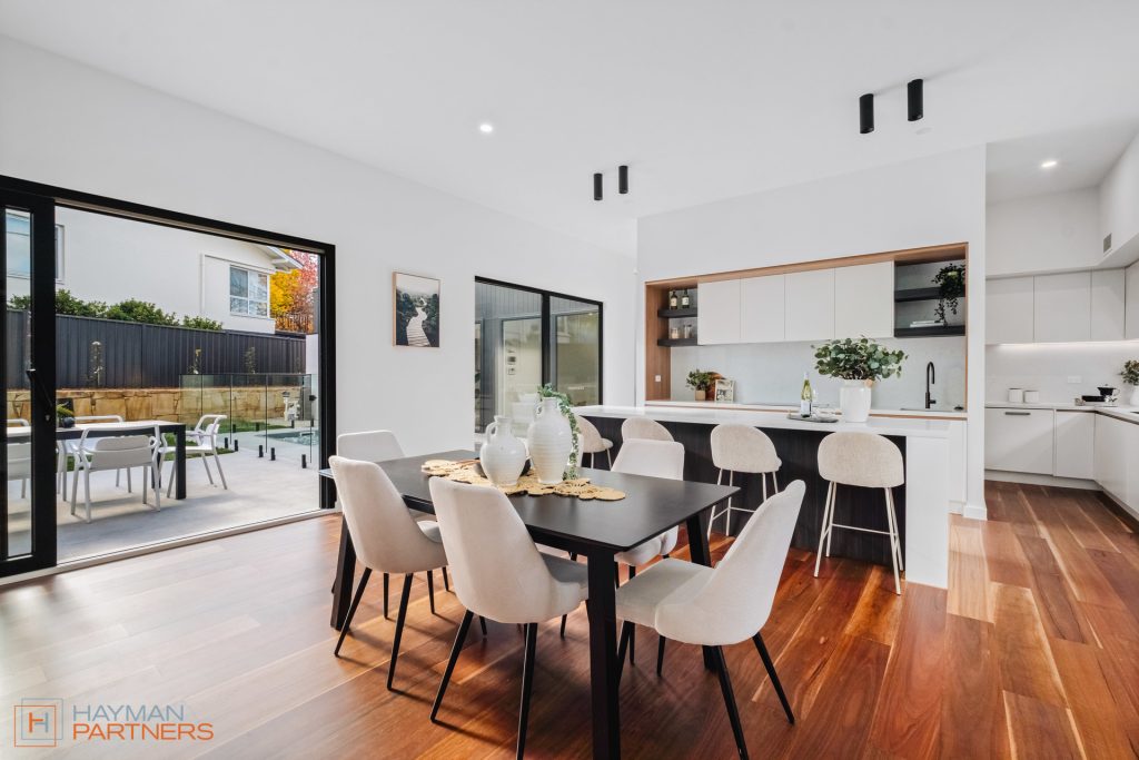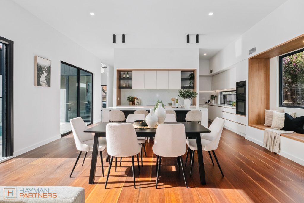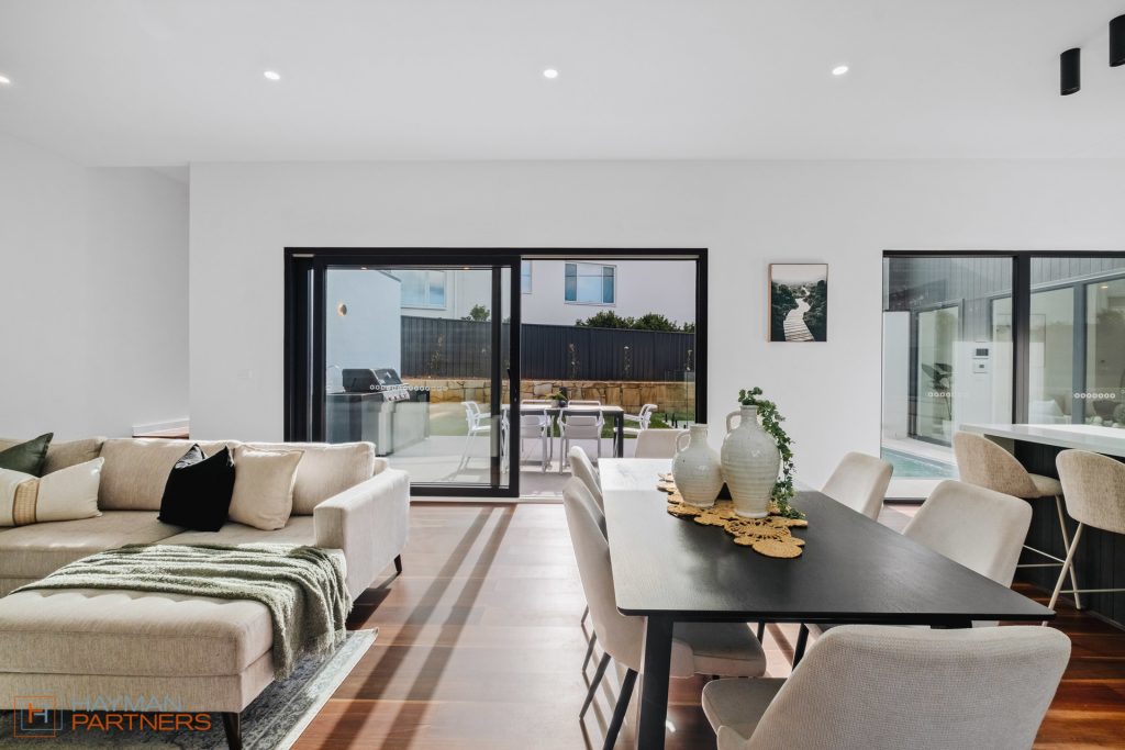 – Expansive open-plan living and dining area with timber flooring and electric fireplace
