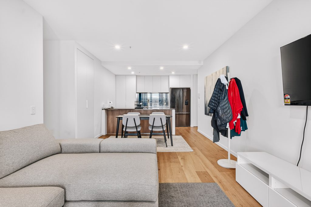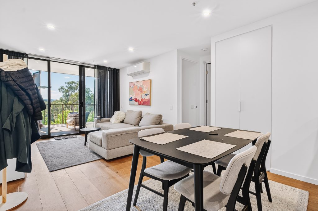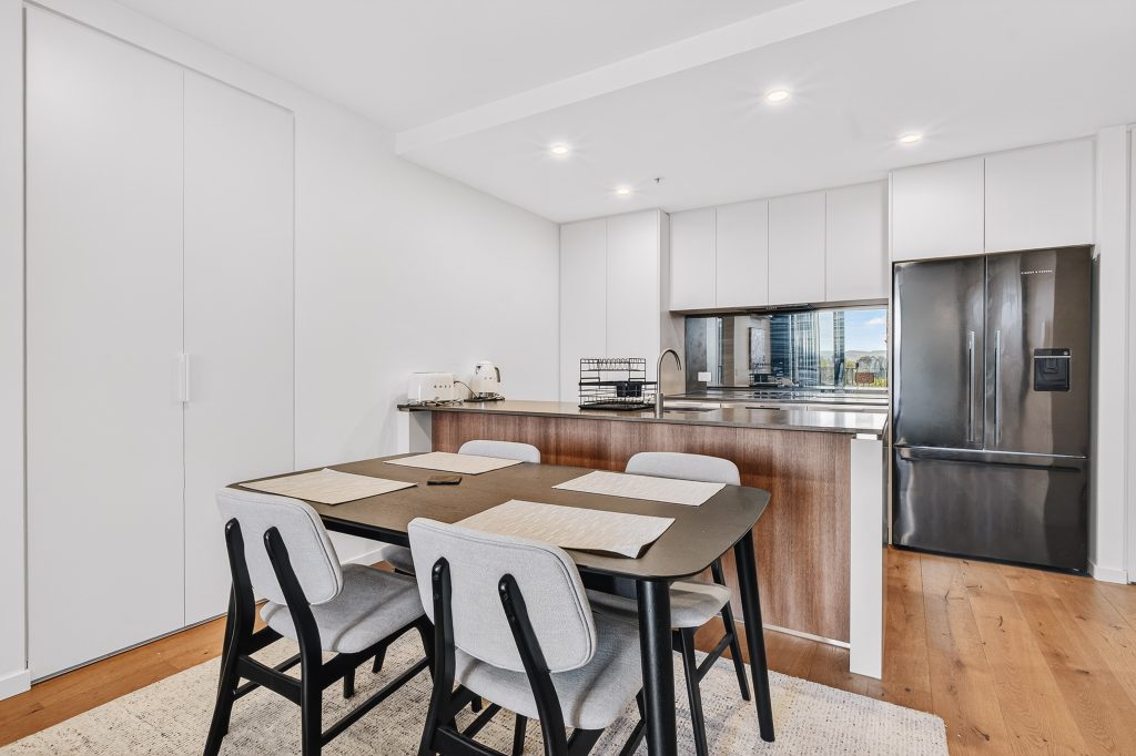 The modern kitchen is impressively sized for an apartment, featuring ample bench space, quality appliances, and plenty of cabinetry – perfect for those who love to cook and entertain. The open living and dining area is filled with natural light and creates a welcoming space to relax or host guests. Step outside to the spacious balcony, ideal for morning coffee, outdoor dining, or simply enjoying the fresh air and surrounding outlook.
