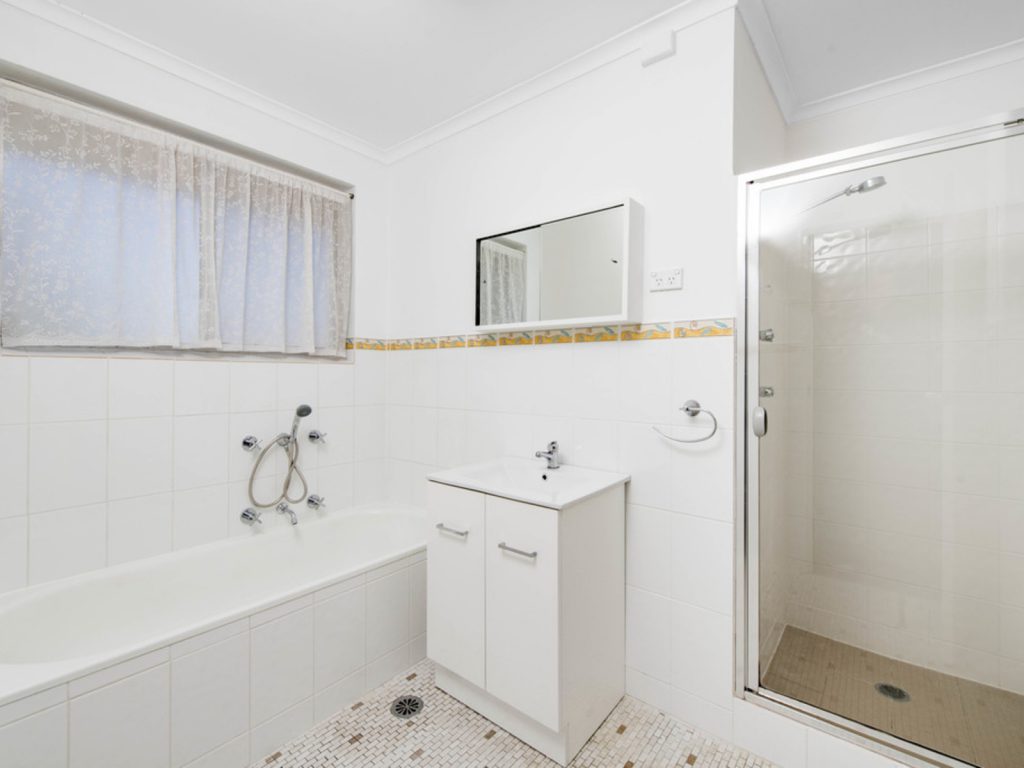 Upgraded bathroom with child friendly bath tub, separate shower recess and modern vanity.