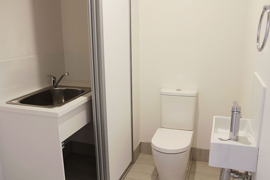 Additional powder room with tucked away European style laundry including dryer.