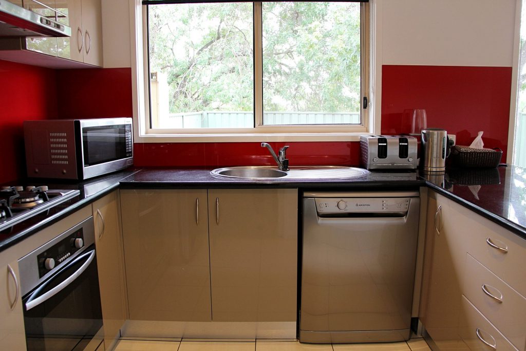 Modern kitchen with dishwasher, gas cooking and convenient storage space.