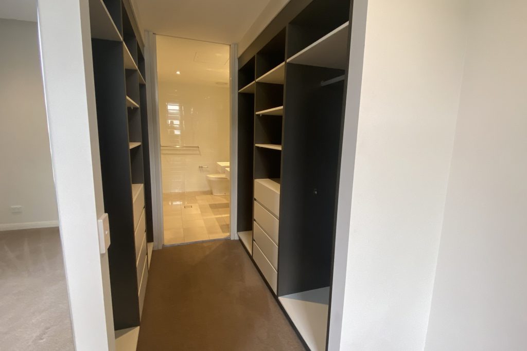 King sized master bedroom with walk through robe including custom shelving & hanging.