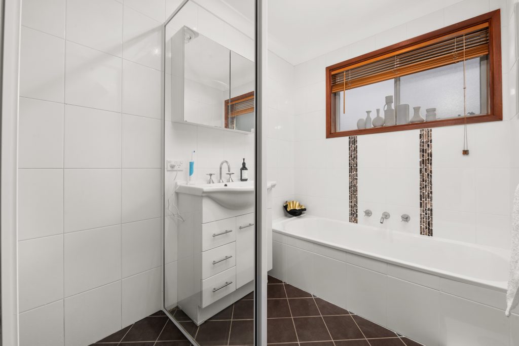 Sparkling main bathroom, with bathtub and separate shower recess.