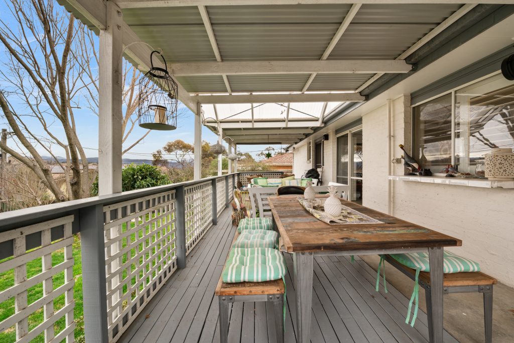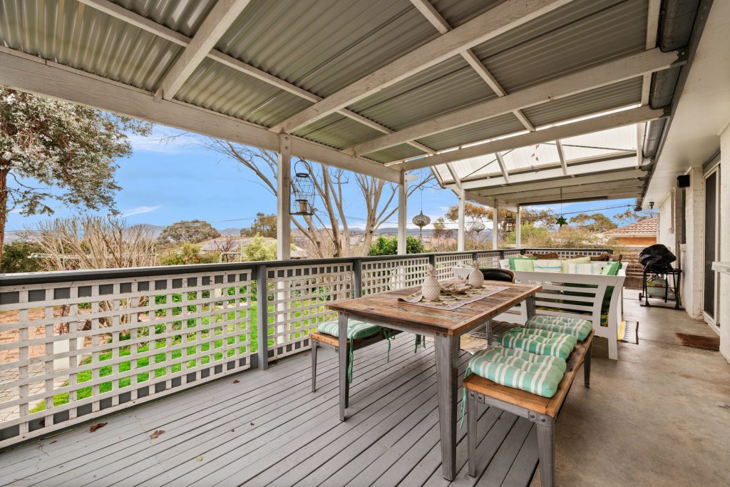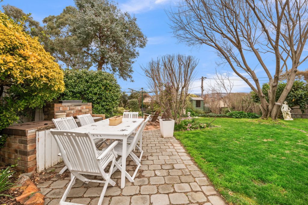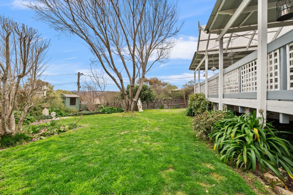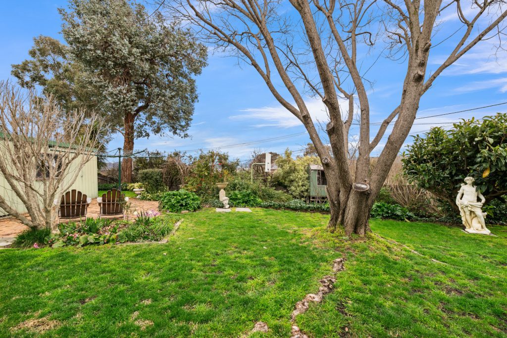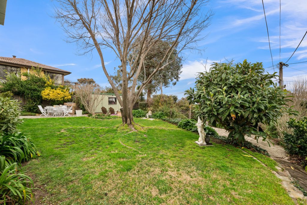 Elevated views from the deck across the backyard which includes a paved area for children to play, a BBQ area, garden shed and shade trees which attract colourful native birds.