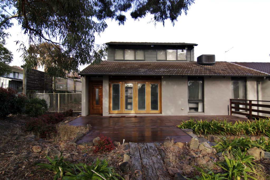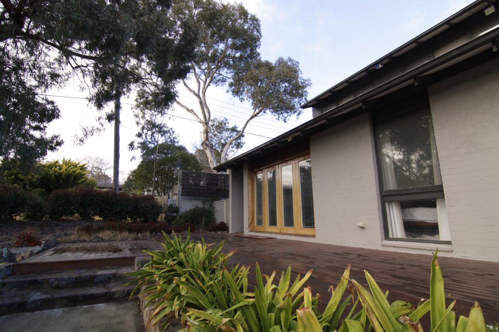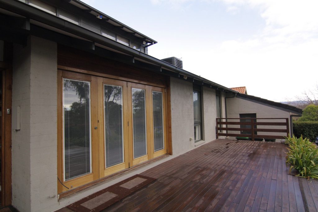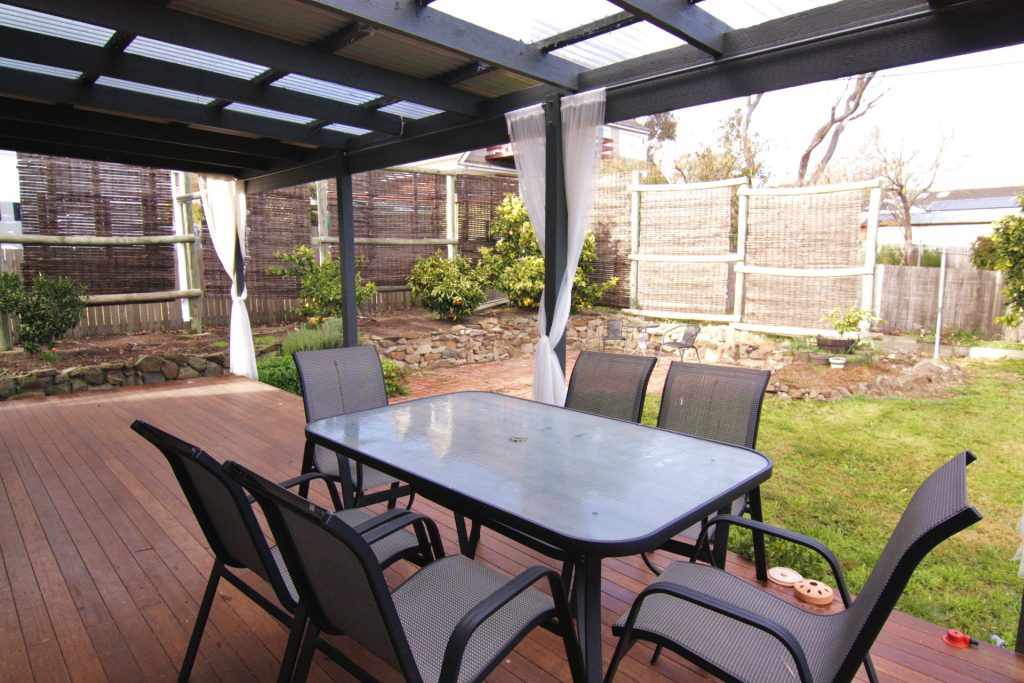 Back deck overlooks large garden with timber privacy screens.
