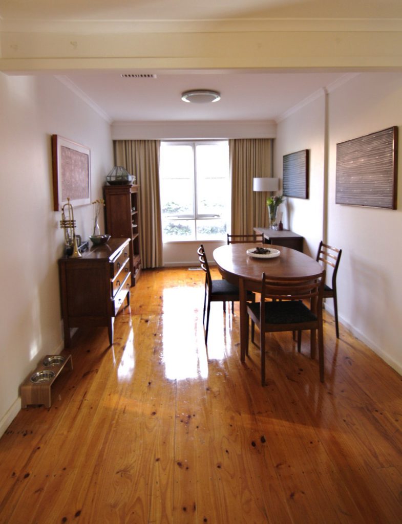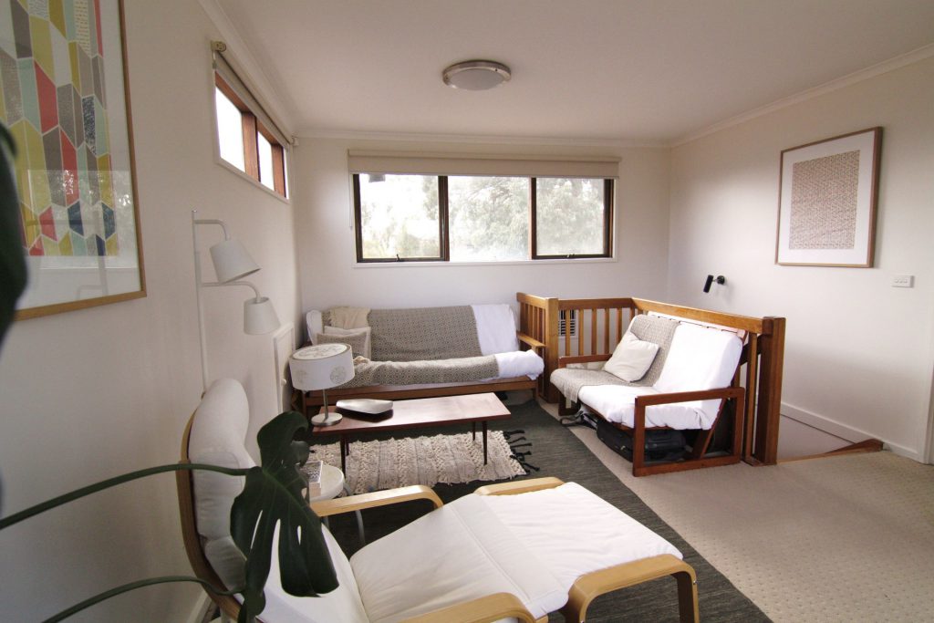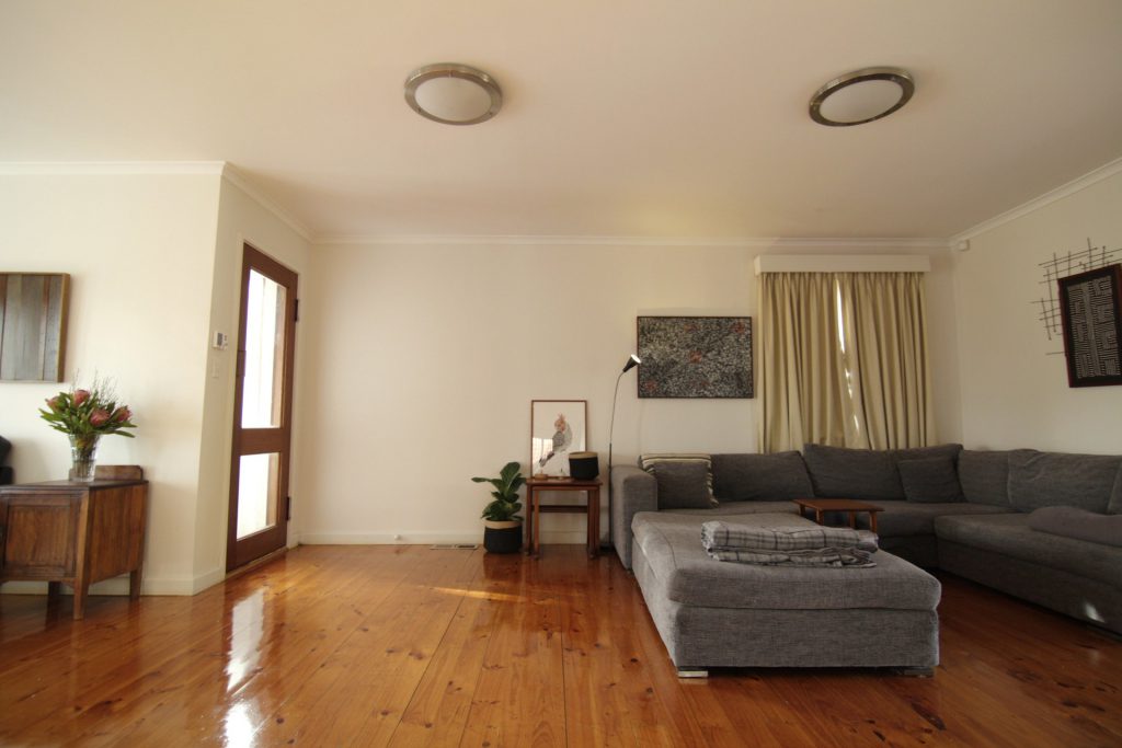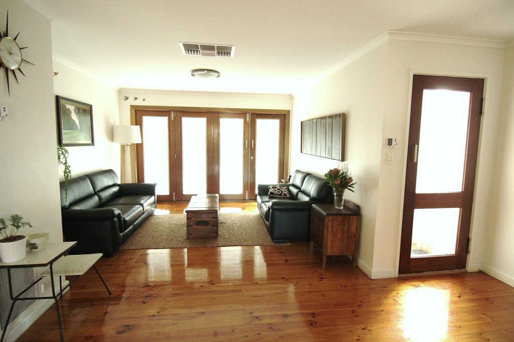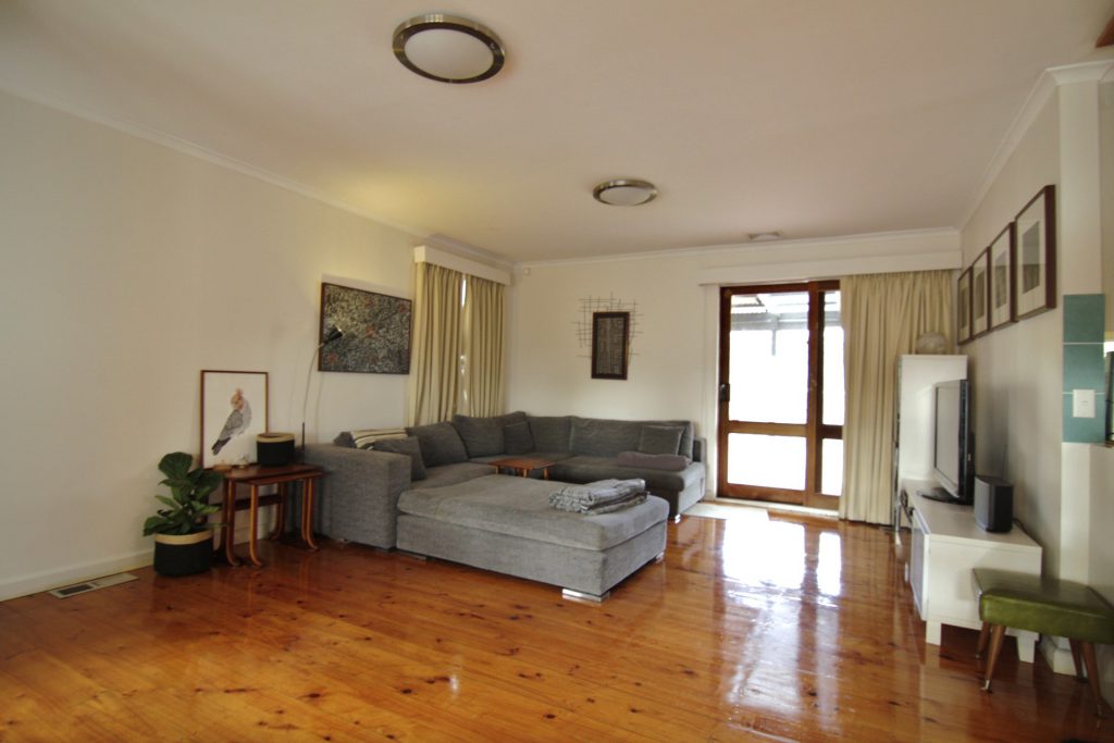 Large lounge/living area with polished floorboards – opens onto front and back decks.