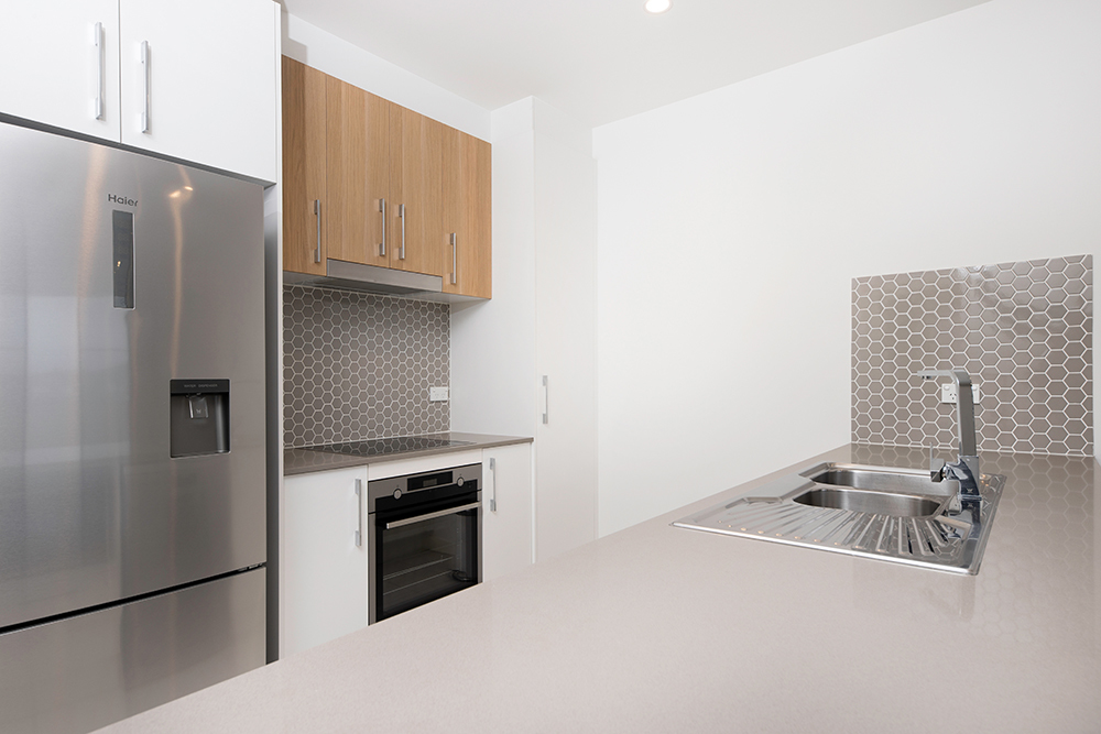– Designer kitchen with stylish detailing and bench top with quality AEG appliances including dishwasher, oven and electric cook top,