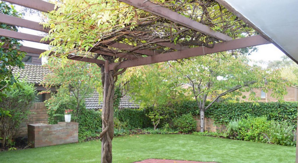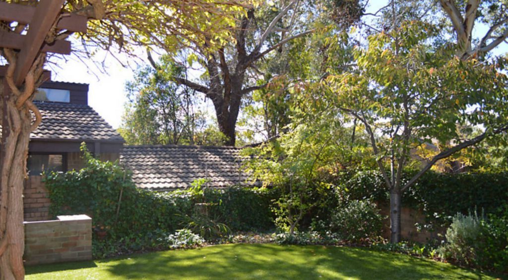 Fully enclosed easy care garden, with paved entertaining area and synthetic evergreen lawn.