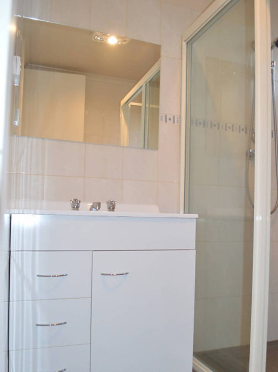 Sparkling renovated bathroom with oversized shower recess & modern vanity.