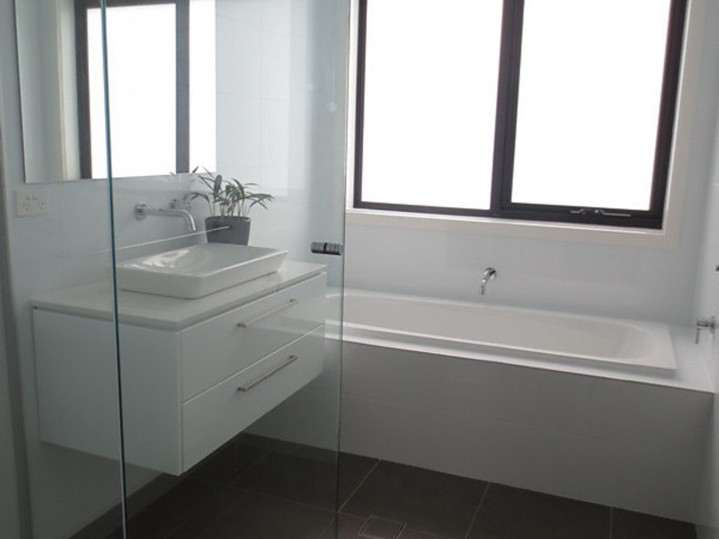 Ensuite with suspended bespoke vanities