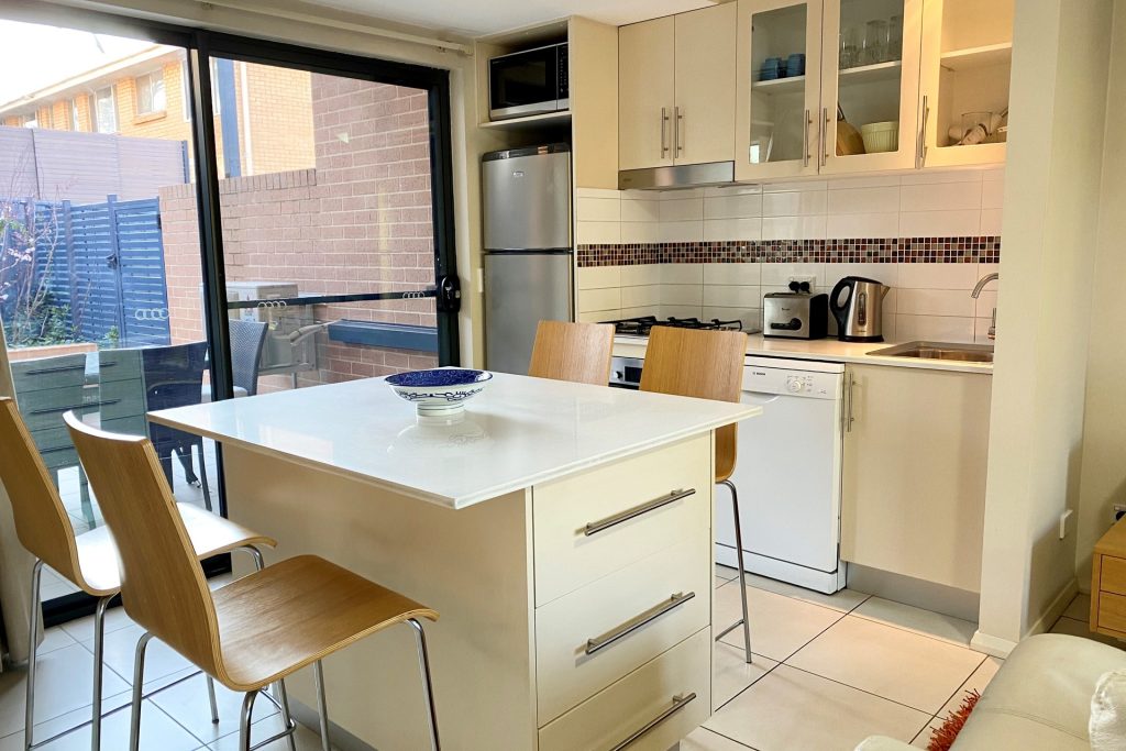 Modern kitchen with stone benchtops, island bench and bespoke joinery. Includes dishwasher, microwave, oven and gas stovetop.