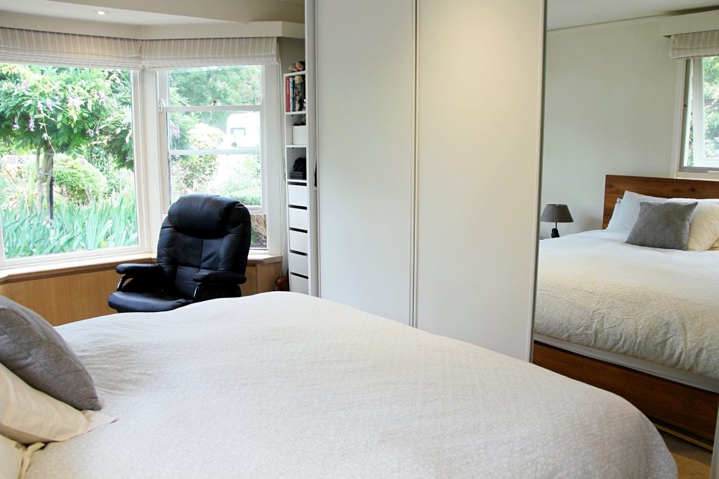 Second bedroom includes mirrored built-in wardrobes and shelving.