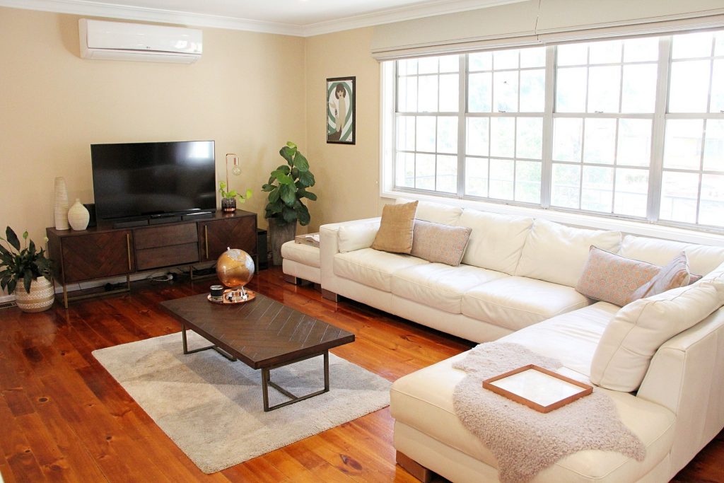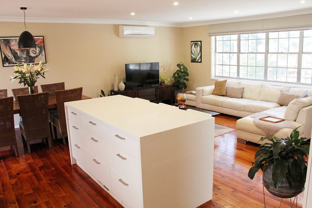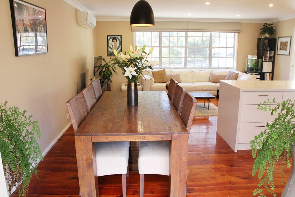 – Generous open plan living and dining area with hardwood flooring and gorgeous white feature windows.