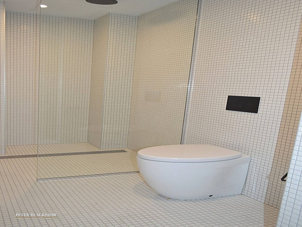Fully tiled bathroom with walk in shower recess with trendy black tapware.