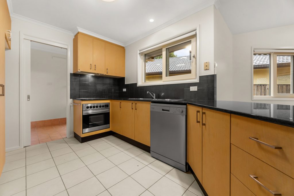 Large kitchen with granite stone benchtops, dishwasher, electric cooking and great storage space.