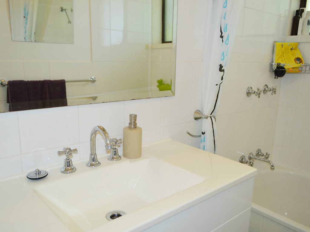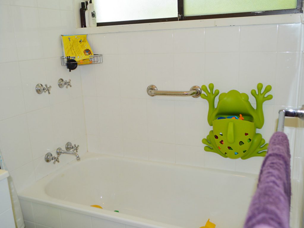 Main bathroom includes child-friendly bath plus shower.